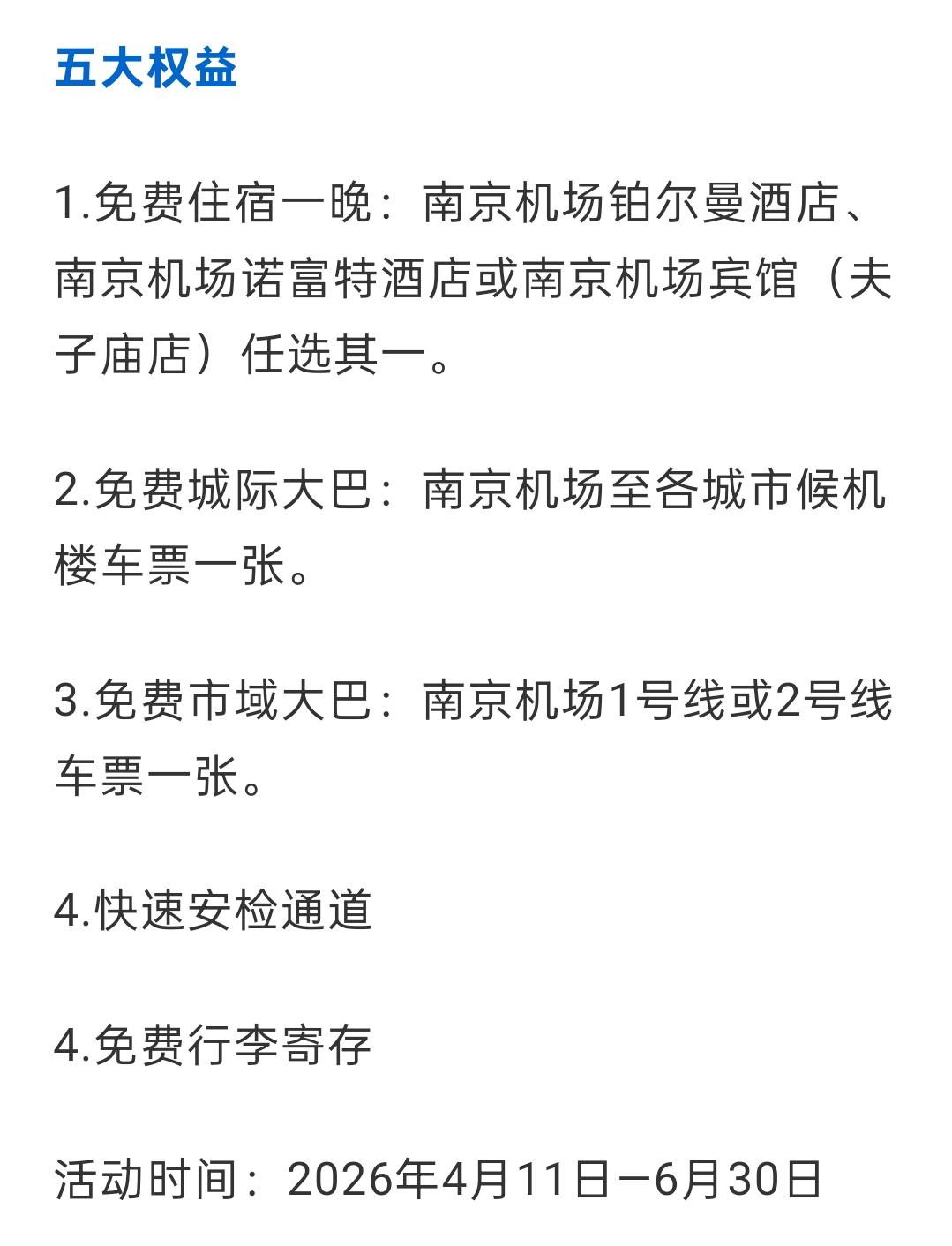 具体的权益内容包括,可以享免费住宿一晚、免费城际及市域大巴、快速安检、免费行李寄存等五大福利。