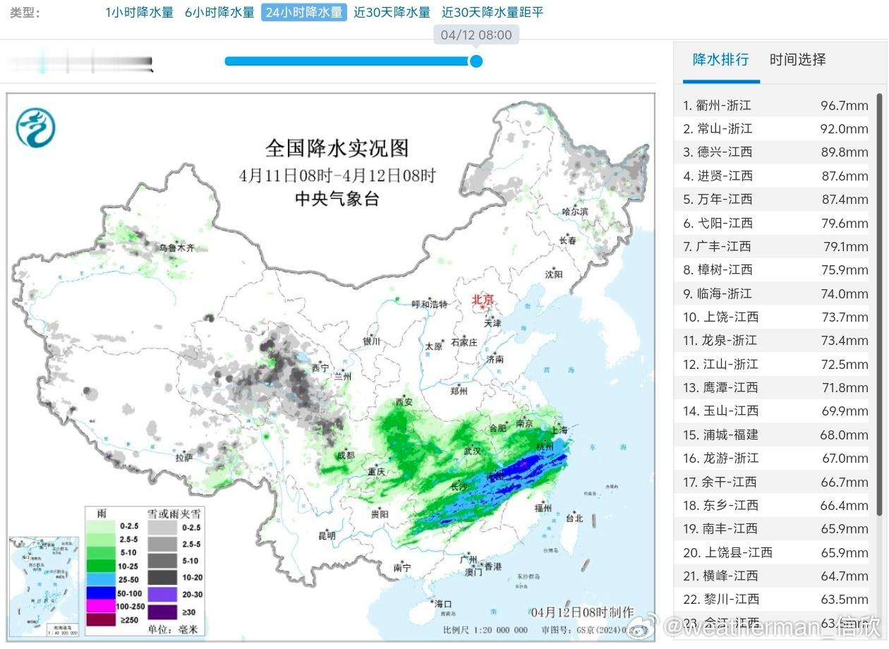【强降水和强对流】昨天到今晨,青藏高原和东北部分地区出现降雪。江南和华南北部出现大范围对流降雨,多地伴随短时强降雨、局地出现雷暴大风等强对流天气。从24小时雨量看浙江、江西、福建部分站点出现暴雨。浙江衢州96.7毫米,排名全国第一。