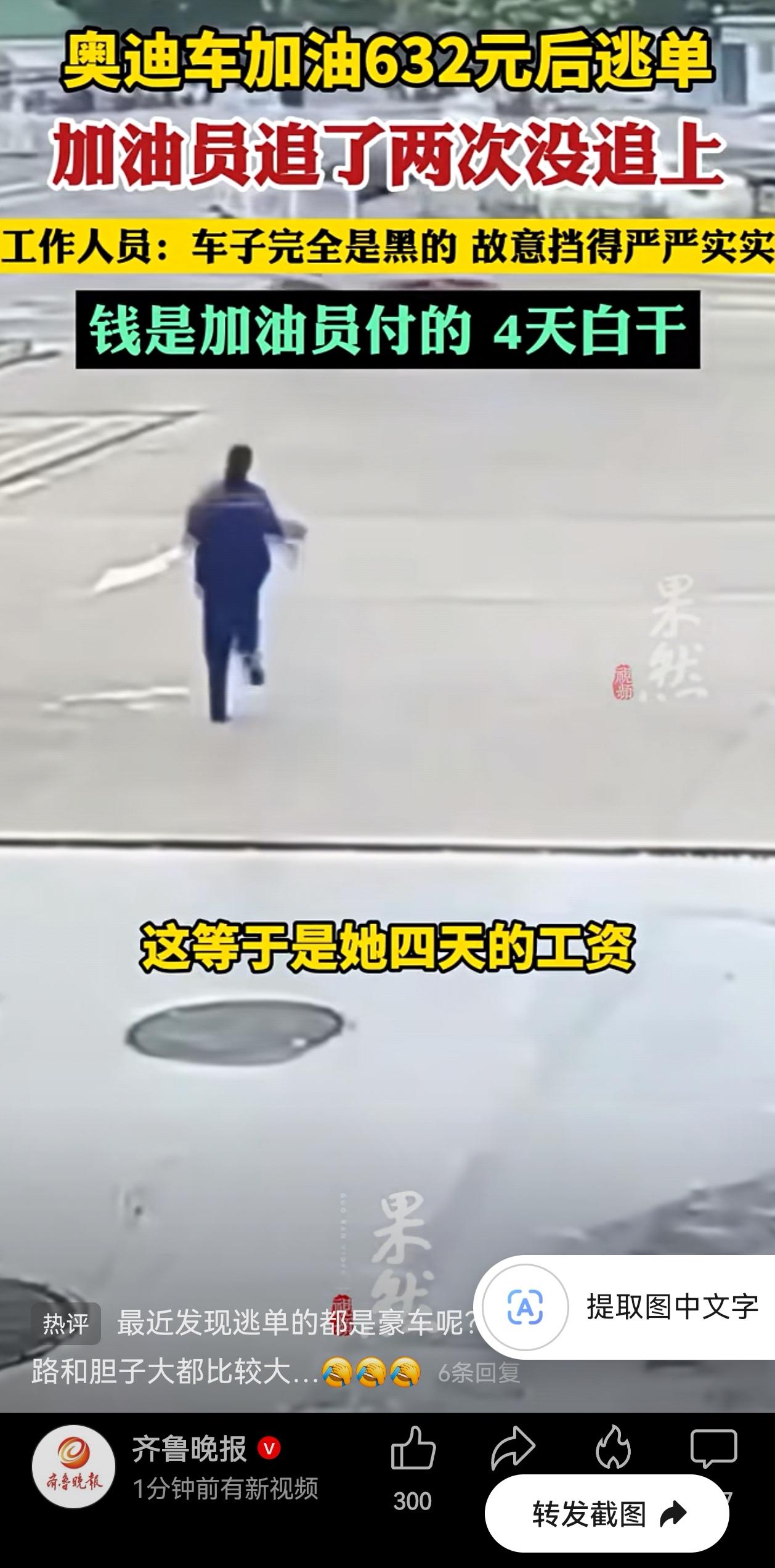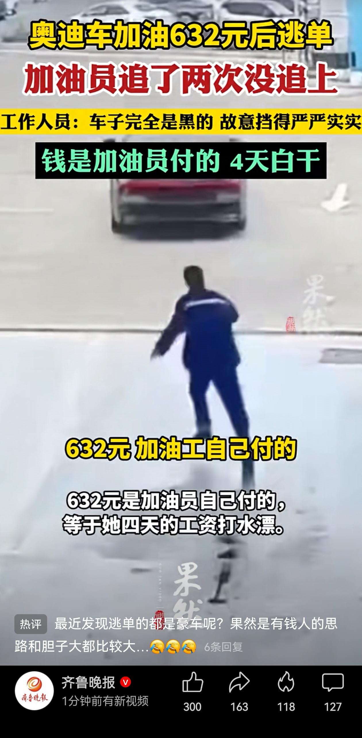 更气人的是,这笔油费要加油站员工自己赔。看着大姐追着奥迪车跑的那几步,心里发紧,开着豪车,油钱却要最穷的人买单,632元,是这位大姐四天的工资,起早贪黑,辛苦四天的工资!