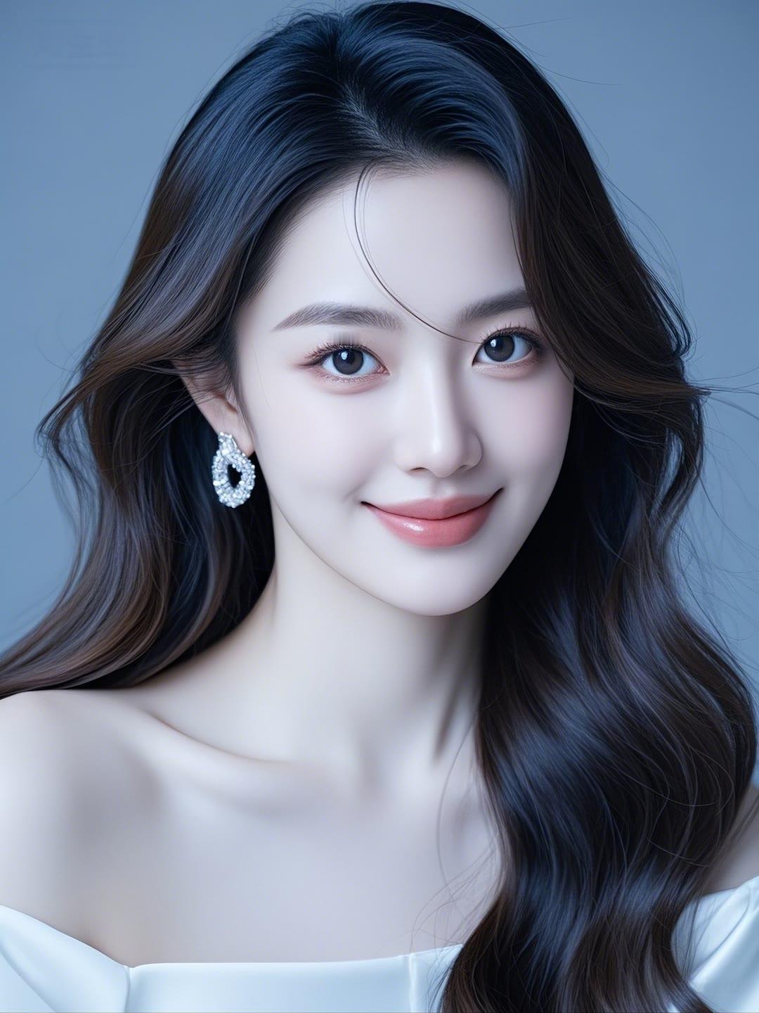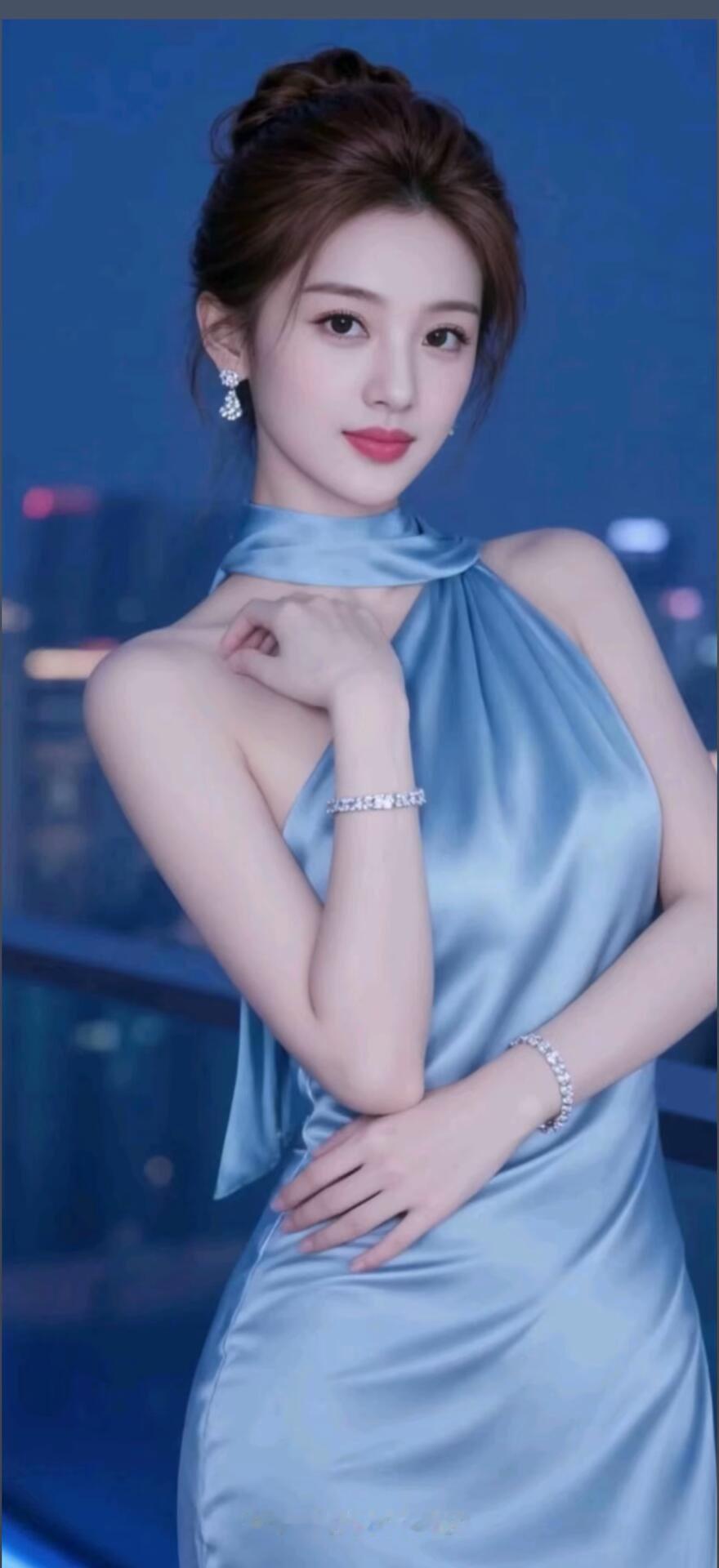 优雅蓝发少女,梦幻妆容,闪耀项链,温柔微笑,时尚穿搭