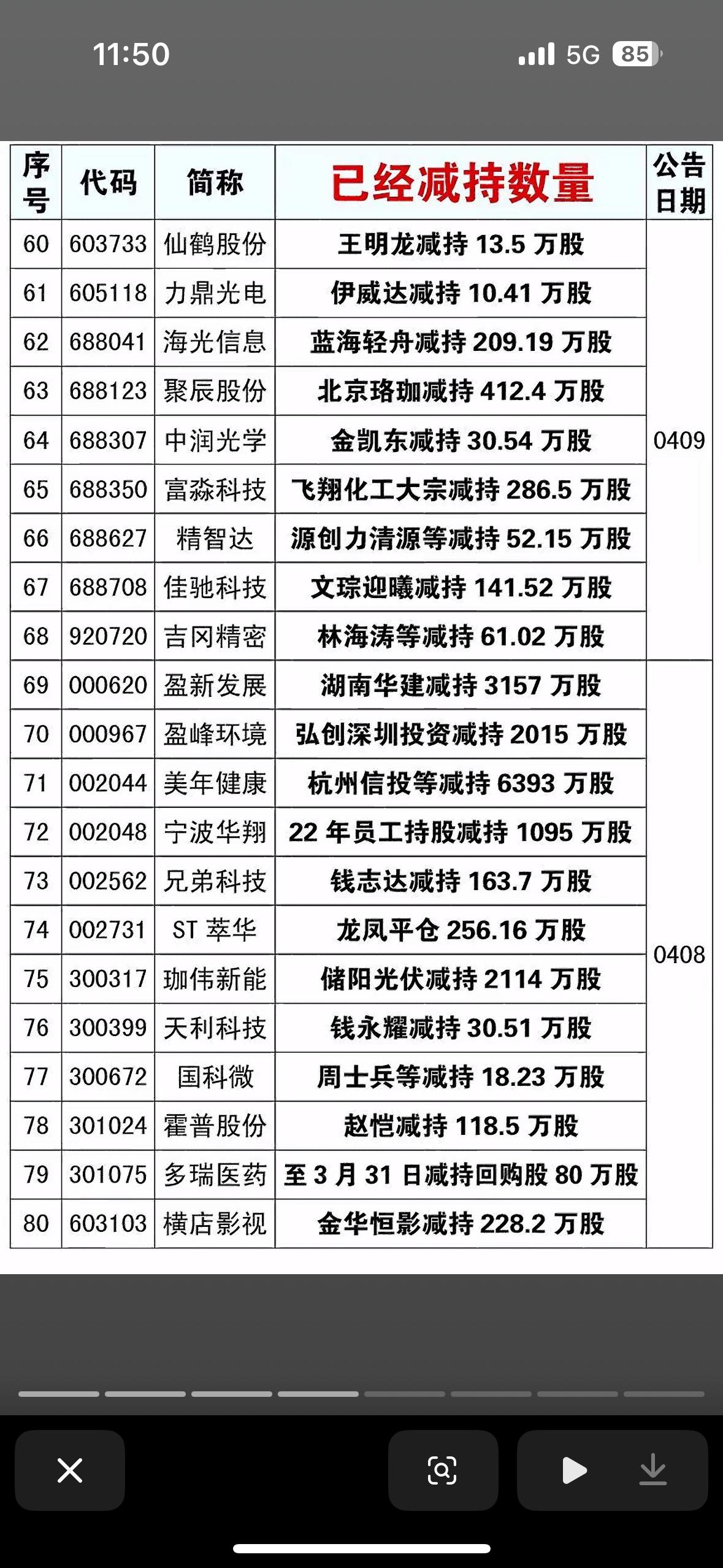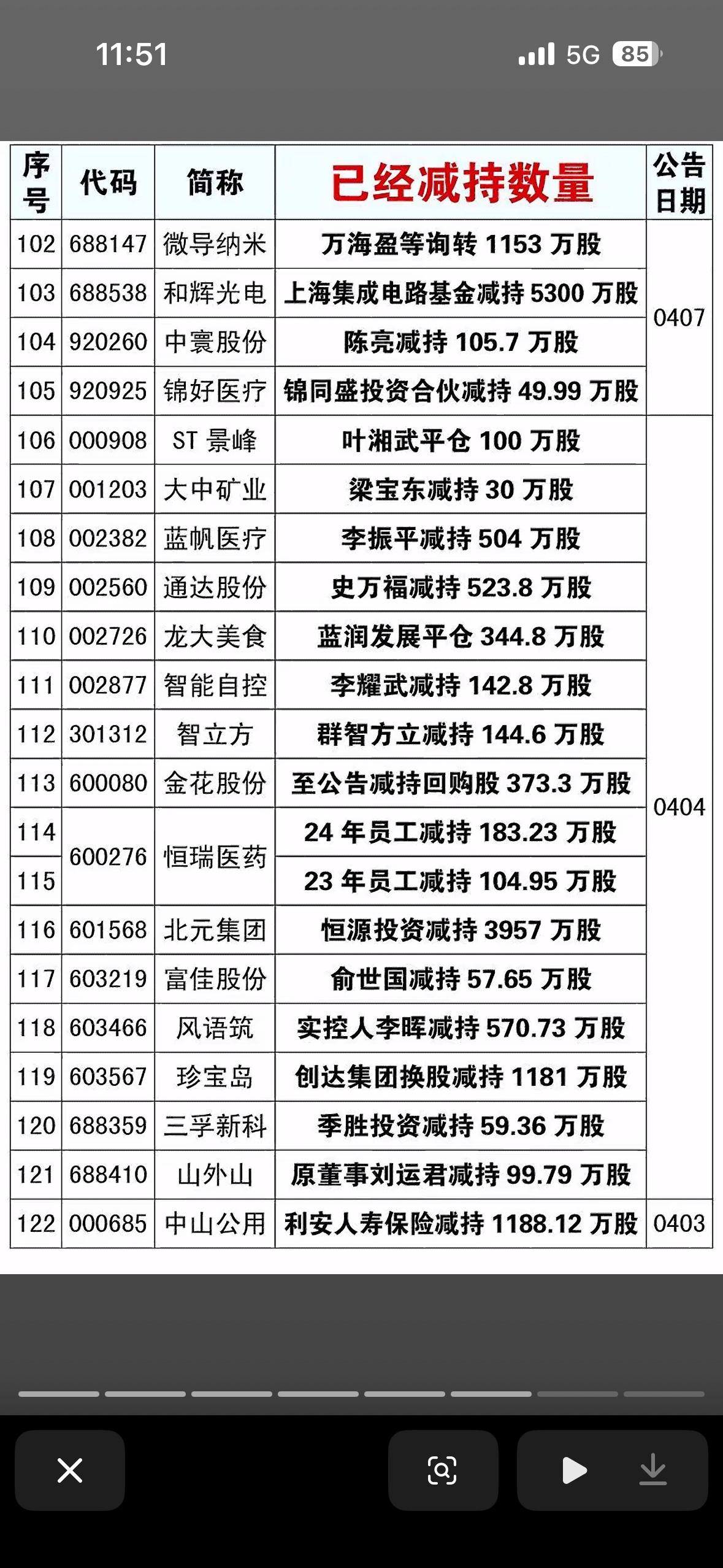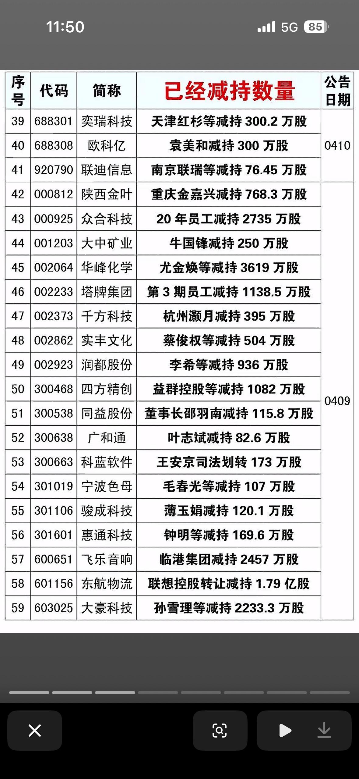 这张图表展示了近期部分上市公司股东的大额减持动态,通常股东减持会被市场解读为短期利空信号,意味着大股东或机构正在套现离场。