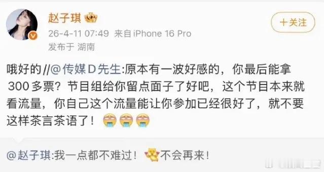 《浪姐》今年的质疑声更大了孙怡明显唱的更好一点,但是1V1还是输了,即便总分更高,但是团内赵子琪被淘汰,赵子琪被淘汰后发文一点都不难过,不会再来,还在凌晨直播透露自己被淘汰后工作人员不让她进去候场区拿包,不过第二天的发布会上又澄清说自己理解错了,粉丝让她去参加湖南卫视《花少》,她说自己咖位不够,的确,湖南卫视的节目很看重咖位和流量,《浪姐》这个节目一直以来最看重的也是流量和背景,实力倒不是很重要,这个节目的本质很显然也不是为了给姐姐们一个翻红的机会。