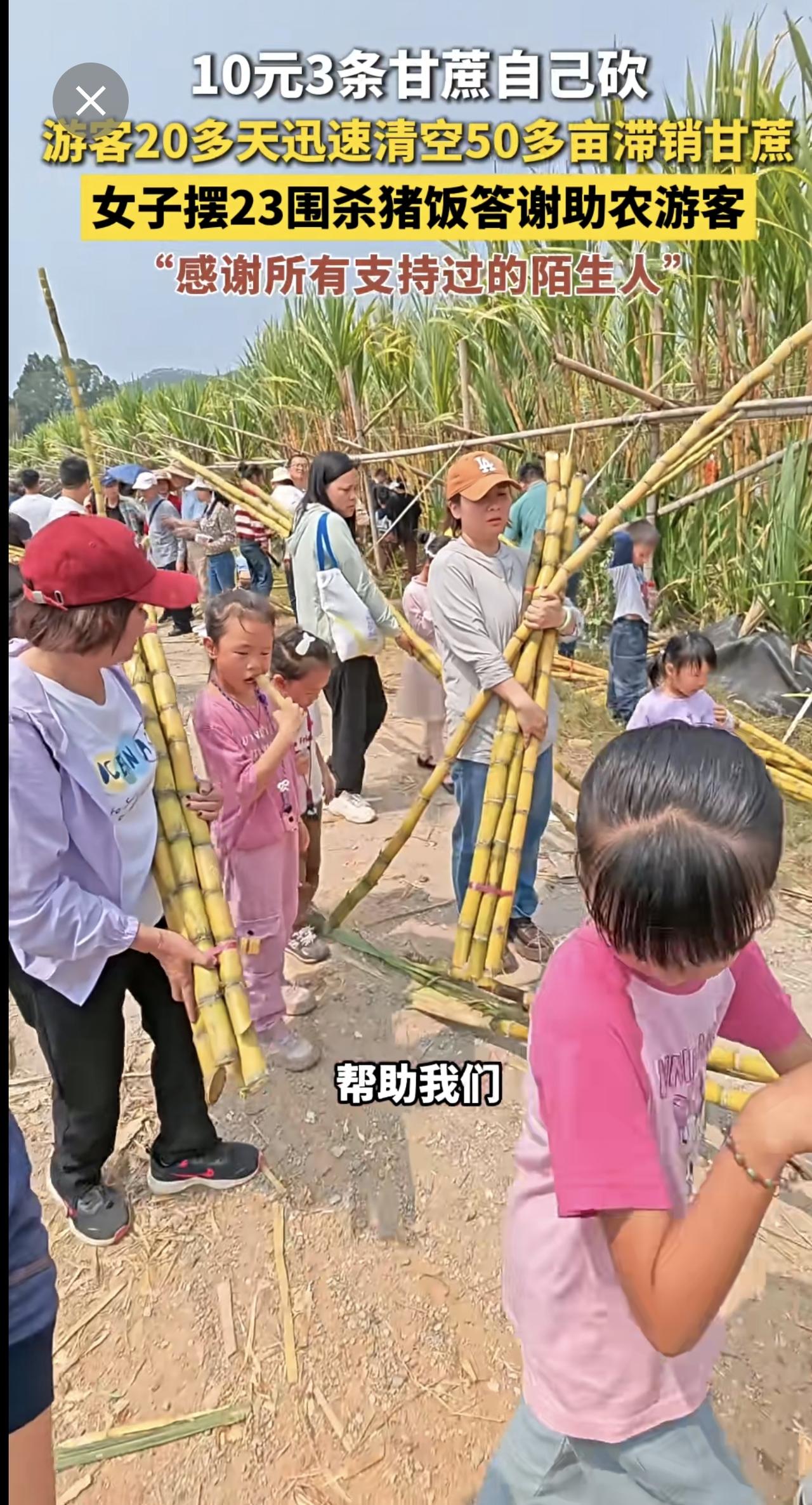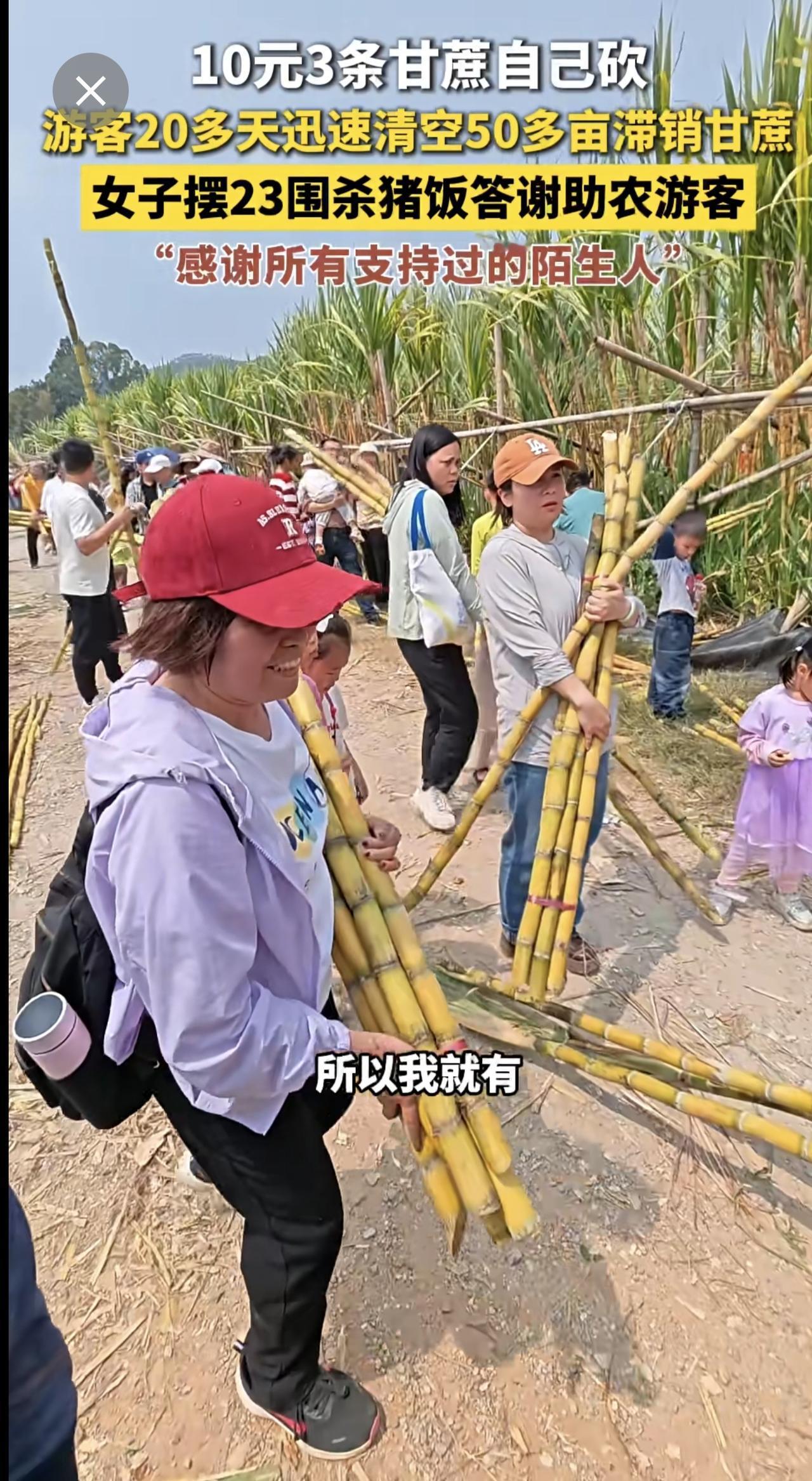 10元3条甘蔗自己砍,游客20多天迅速清空50多亩滞销甘蔗,女子摆23围杀猪饭答