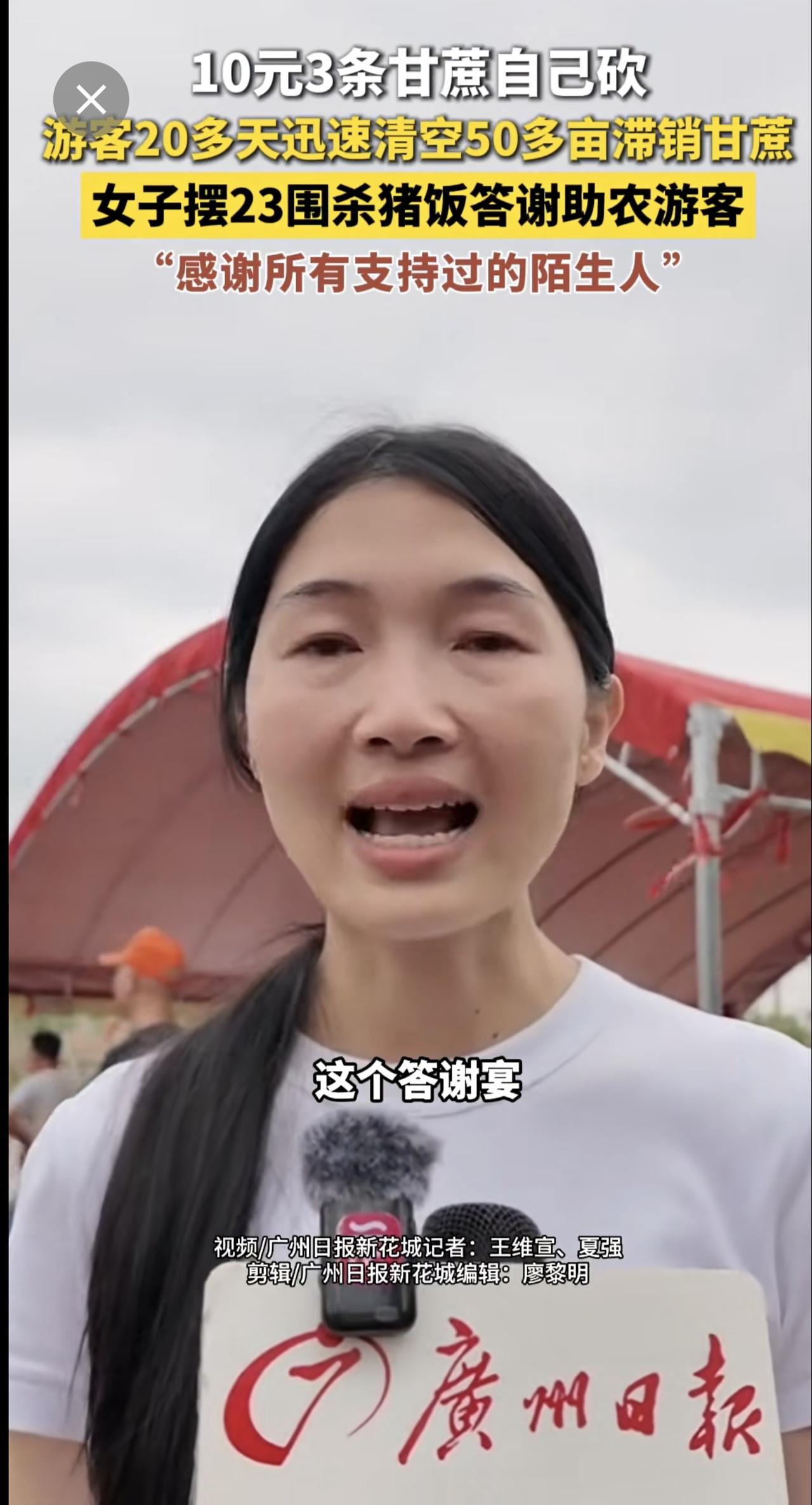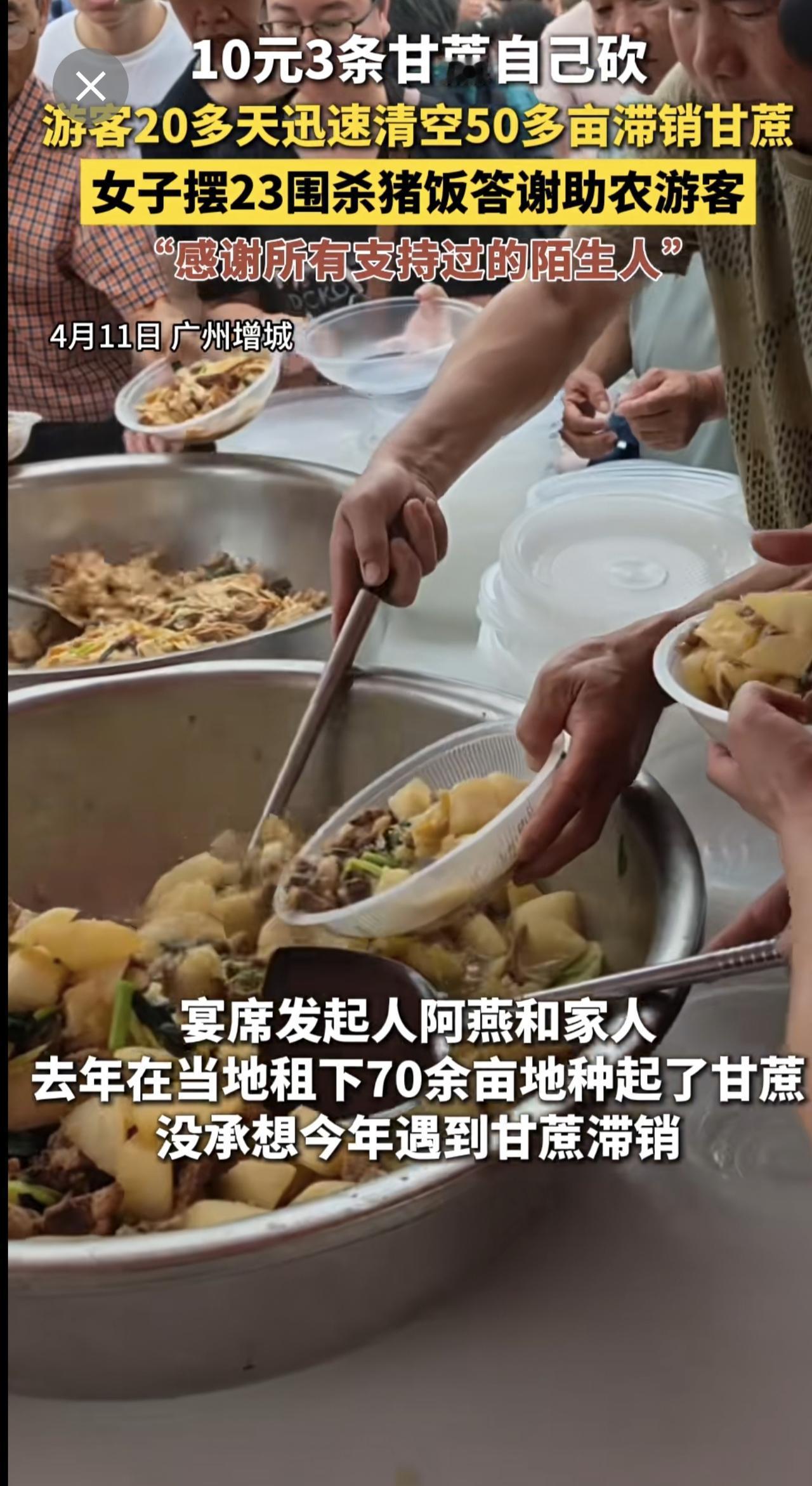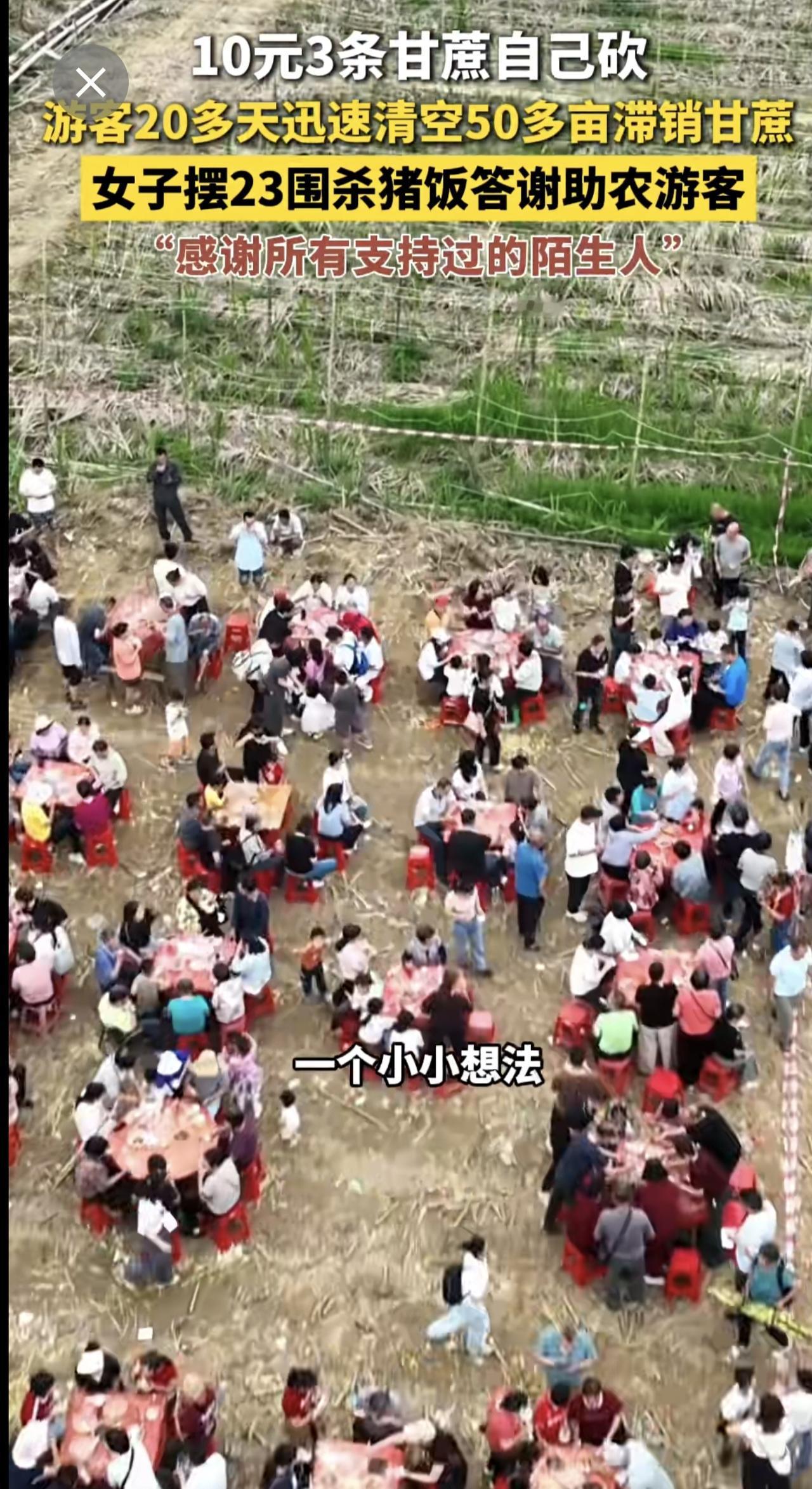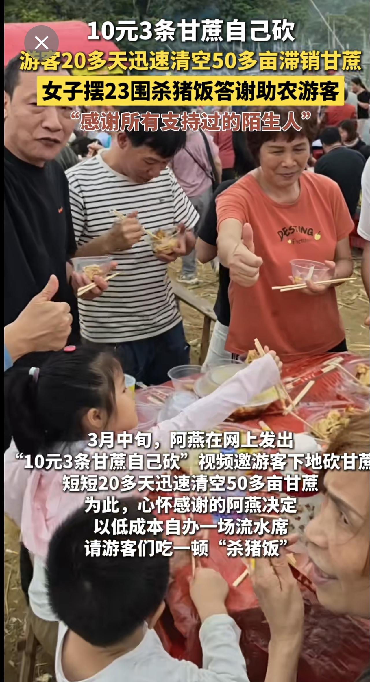 10元3条甘蔗自己砍,游客20多天迅速清空50多亩滞销甘蔗,女子摆23围杀猪饭答谢助农游客,“感谢所有支持过的陌生人”