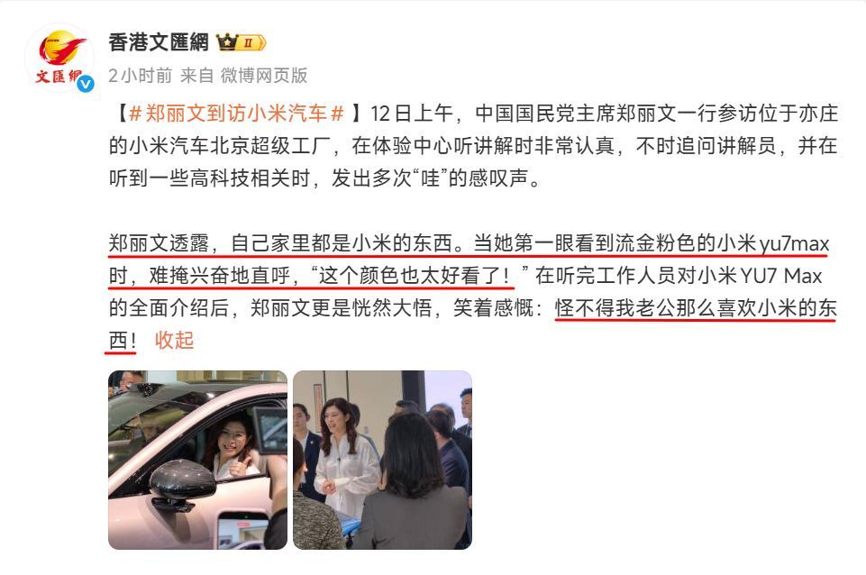 郑丽文到访大陆的最后一站,来到了位于北京亦庄的小米汽车超级工厂,由卢伟冰亲自接待! 万万没想到郑丽文还是小米的用户,她透露丈夫还非常喜欢小米的产品,家里都是小米的东西;体验完小米YU7后还说希望可以带一台回去。