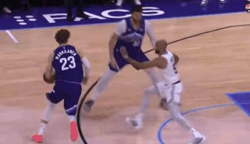 怀特不一定跳得多高,但他有神奇的弹速,足以后发先至。一个古怪的能力:即便失去平衡,他还是能起跳。而他对此了如指掌。知道自己多能跳、能在何时跳到后,怀特就能把握起跳时机与角度选择了。这是他最隐秘的技能,攻防两端都能体现——还记得2023年的那次空接绝杀吗?所以:当必须闪过掩护时,他可以侧身、跳步,在身体不平衡时判断到时机,出手,侧盖。