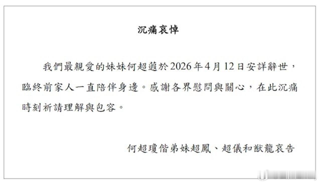 赌王二房三女何超蕸去世今日安详离世,终年60岁 。她是何超琼、何超凤疼爱的妹妹,是信德集团低调实干的执行董事,更是一生热心公益、承继赌王慈善精神的名门闺秀 。一生低调不争,默默为香港、为内地公益与青年事务奉献 。临终有家人陪伴,走得安详 。愿天堂没有病痛,一路走好