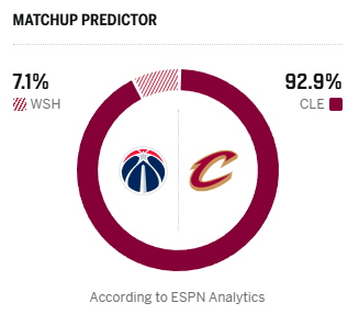ESPN预测明日比赛:骑士胜率92.9%,奇才胜率7.1%
