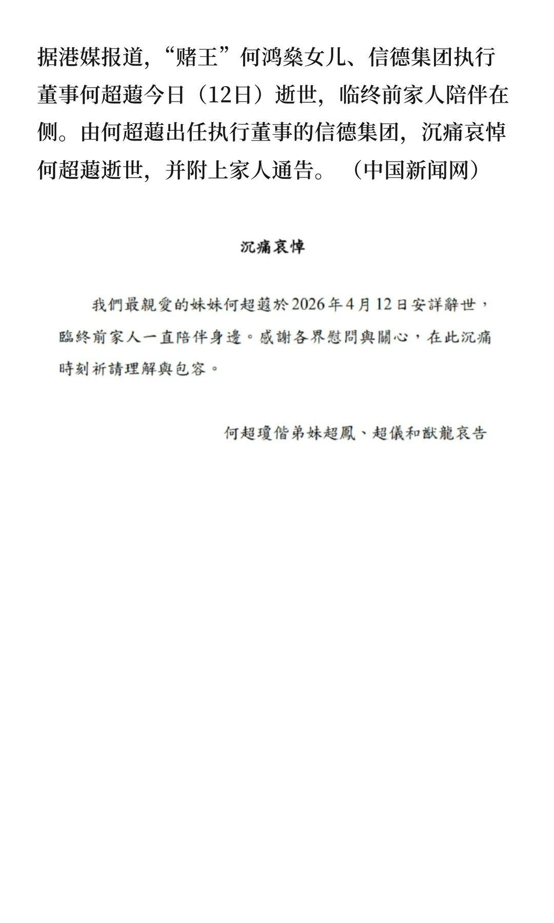 何超蕸去世据港媒报道,2026年4月12日,已故“赌王”何鸿燊与二太蓝琼缨的三女