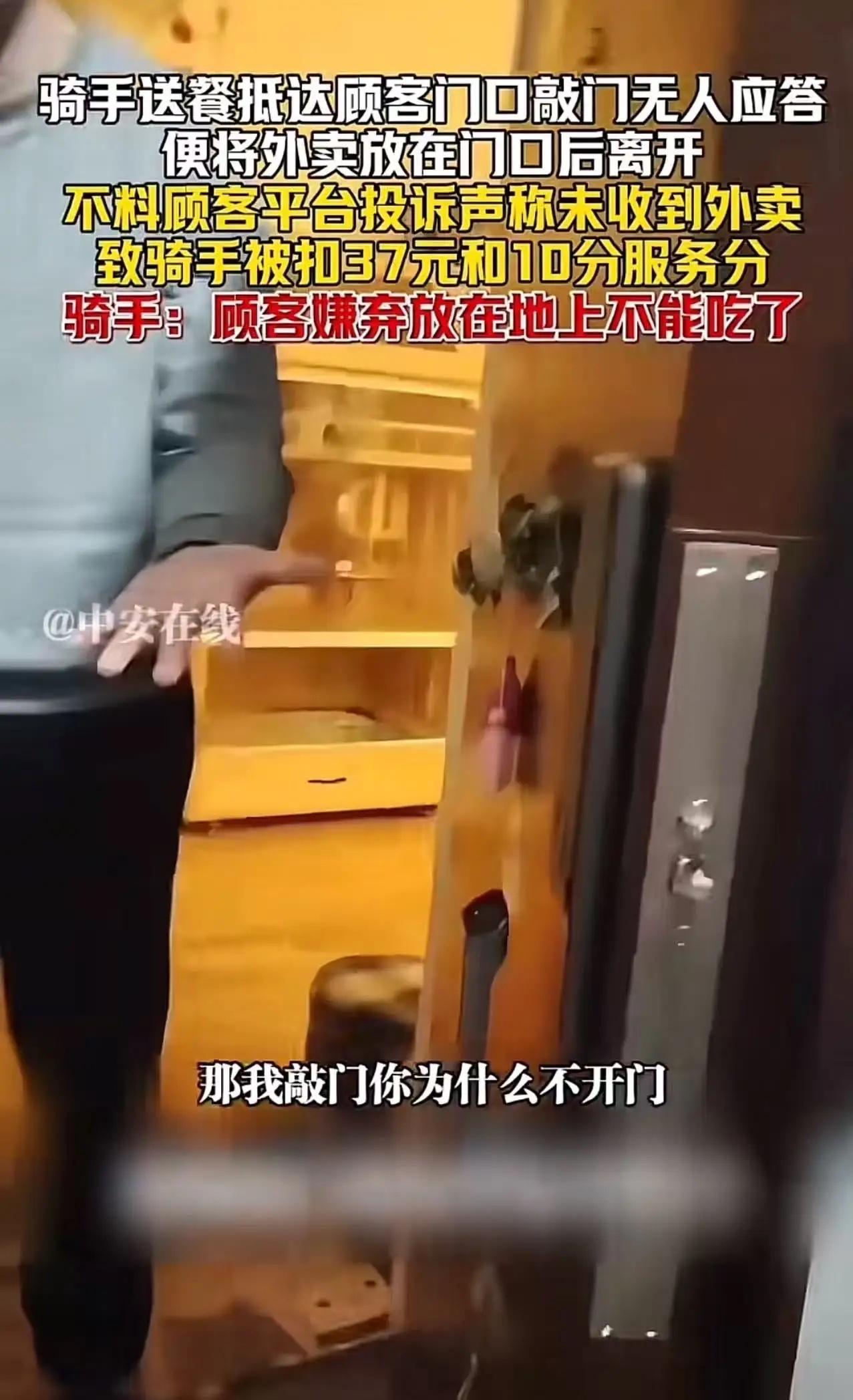 吵翻了!上海,骑手送餐抵达顾客门口敲门无人应答,便将外卖放在门口后离开,不料顾客嫌弃放在地上不能吃了,向平台投诉声称未收到外卖,致骑手被扣37元和10分服务分,骑手:“明明送到了为什么说没收到!”顾客:“没交到我手上!”