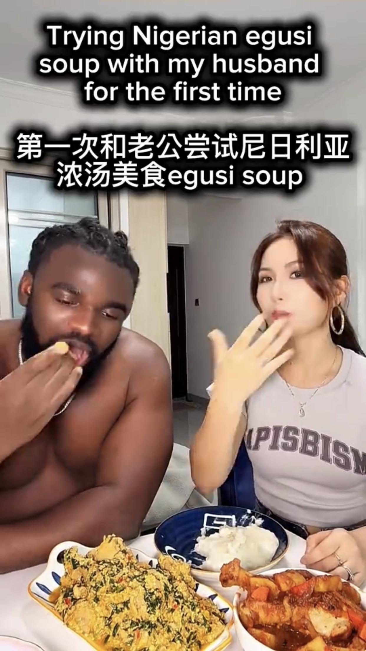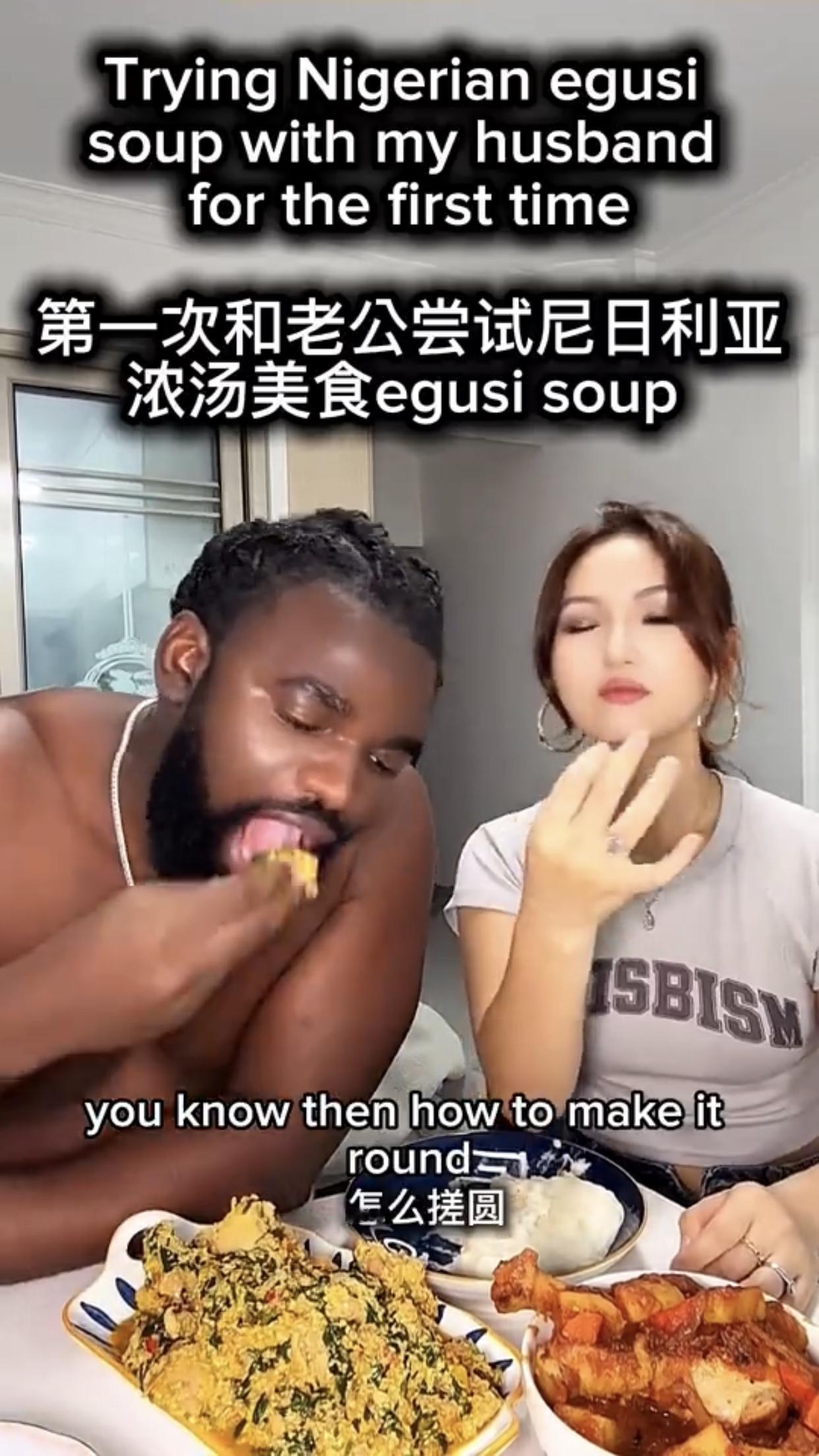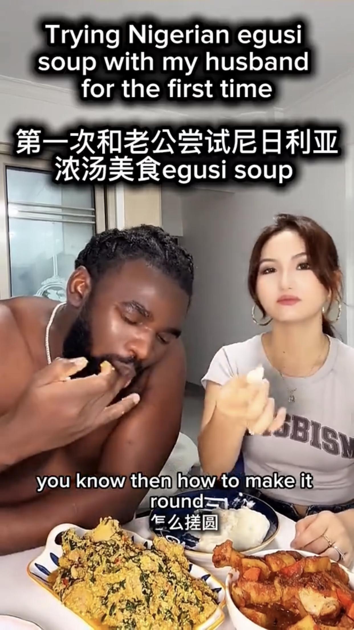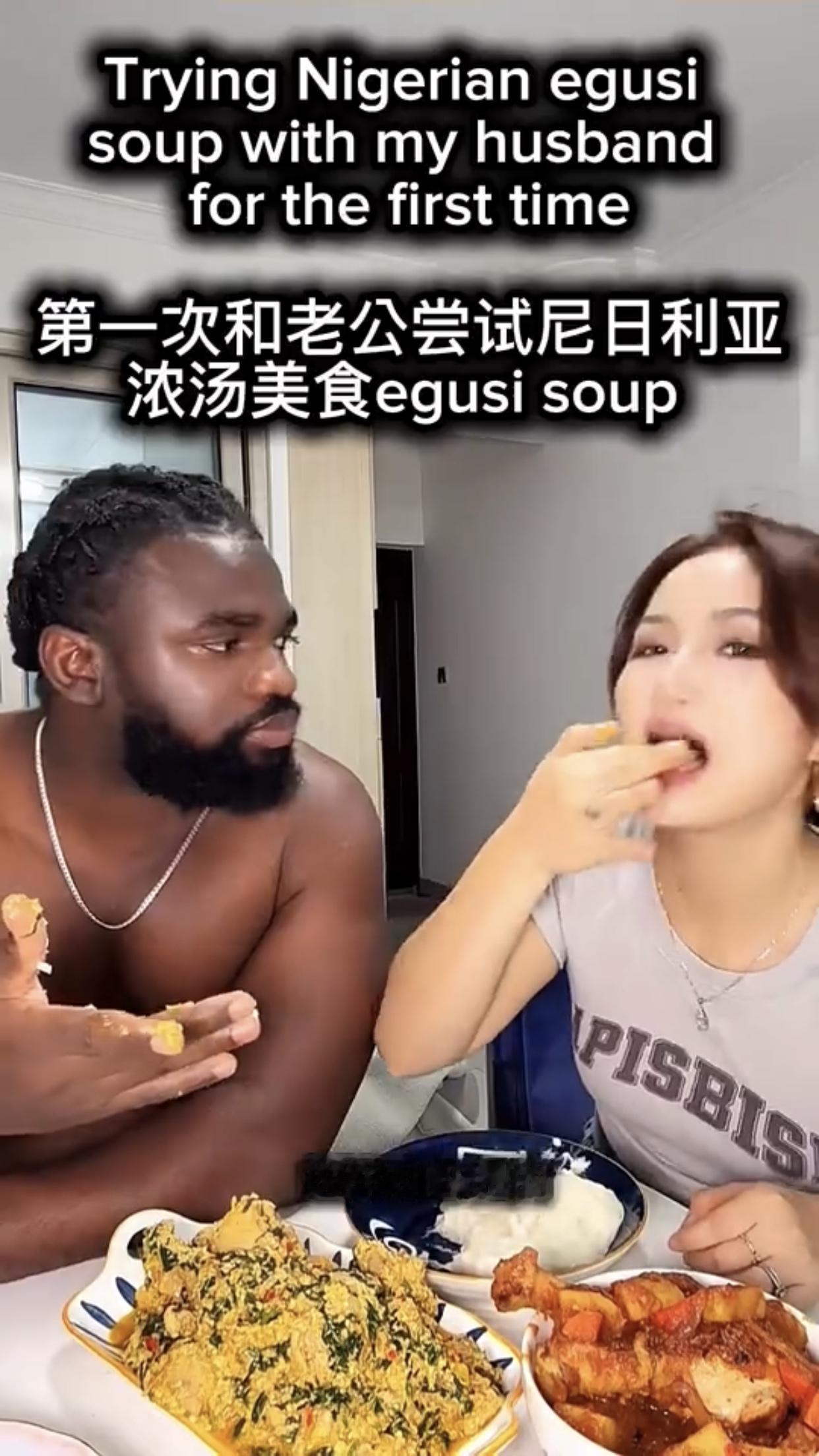 中国女子和她的非洲黑人老公第一次尝试吃尼日利亚浓汤美食egusi soup,他的