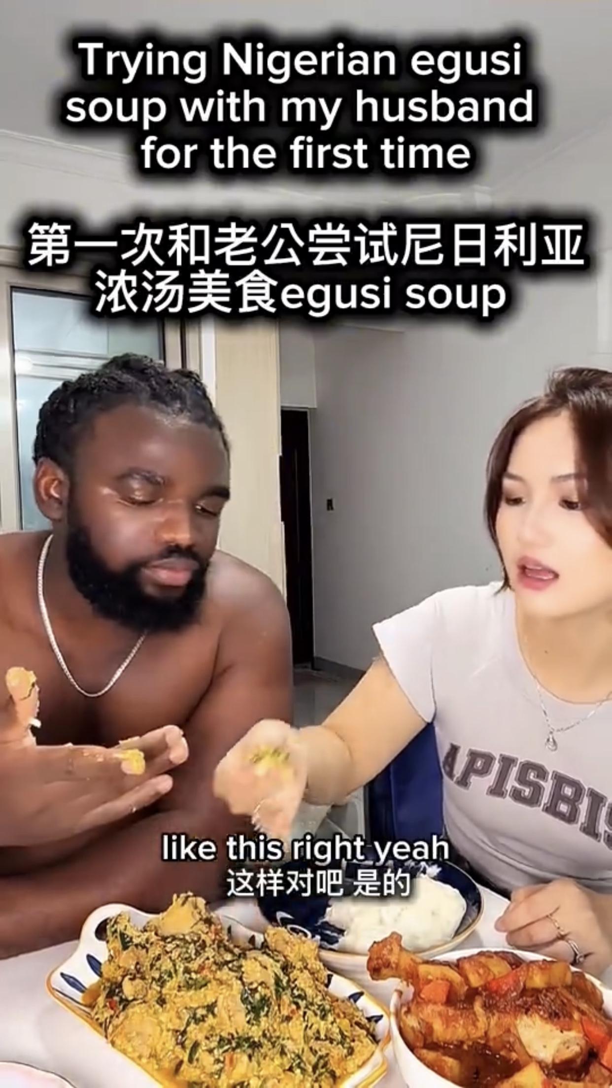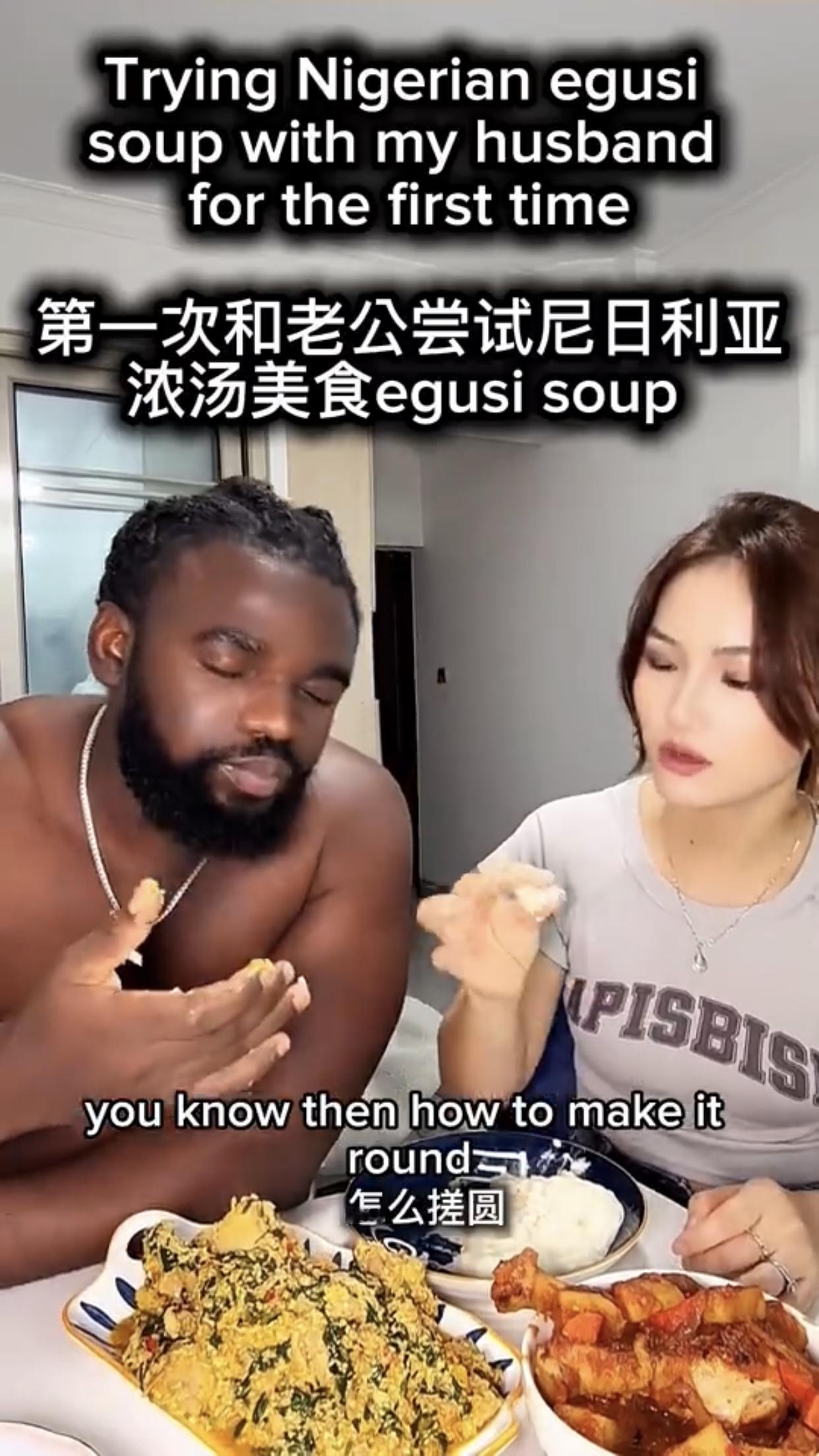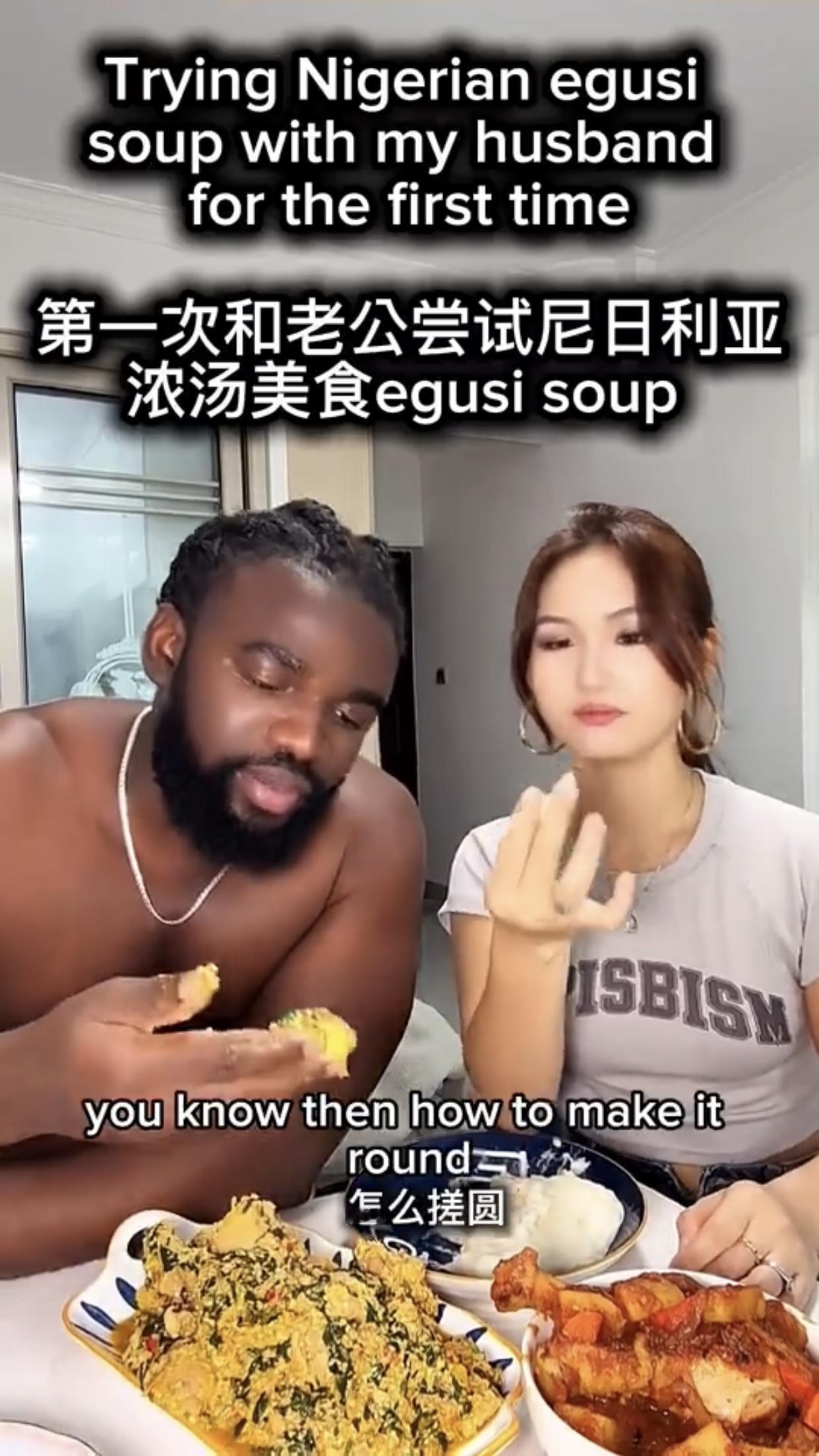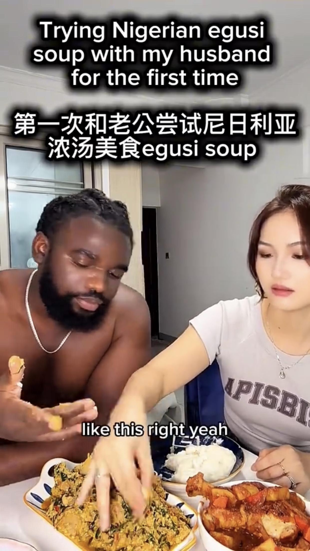 中国女子和她的非洲黑人老公第一次尝试吃尼日利亚浓汤美食egusi soup,他的