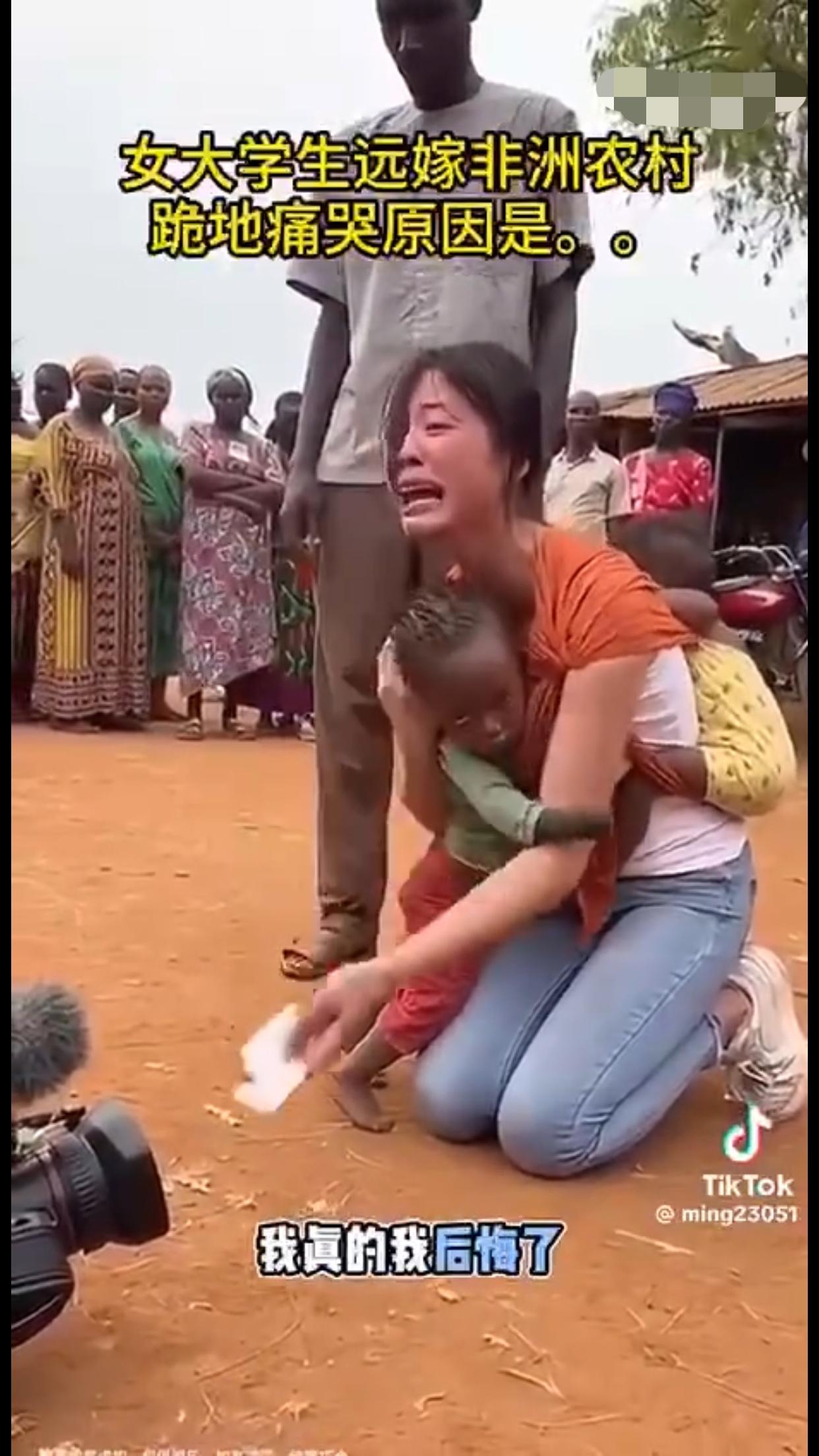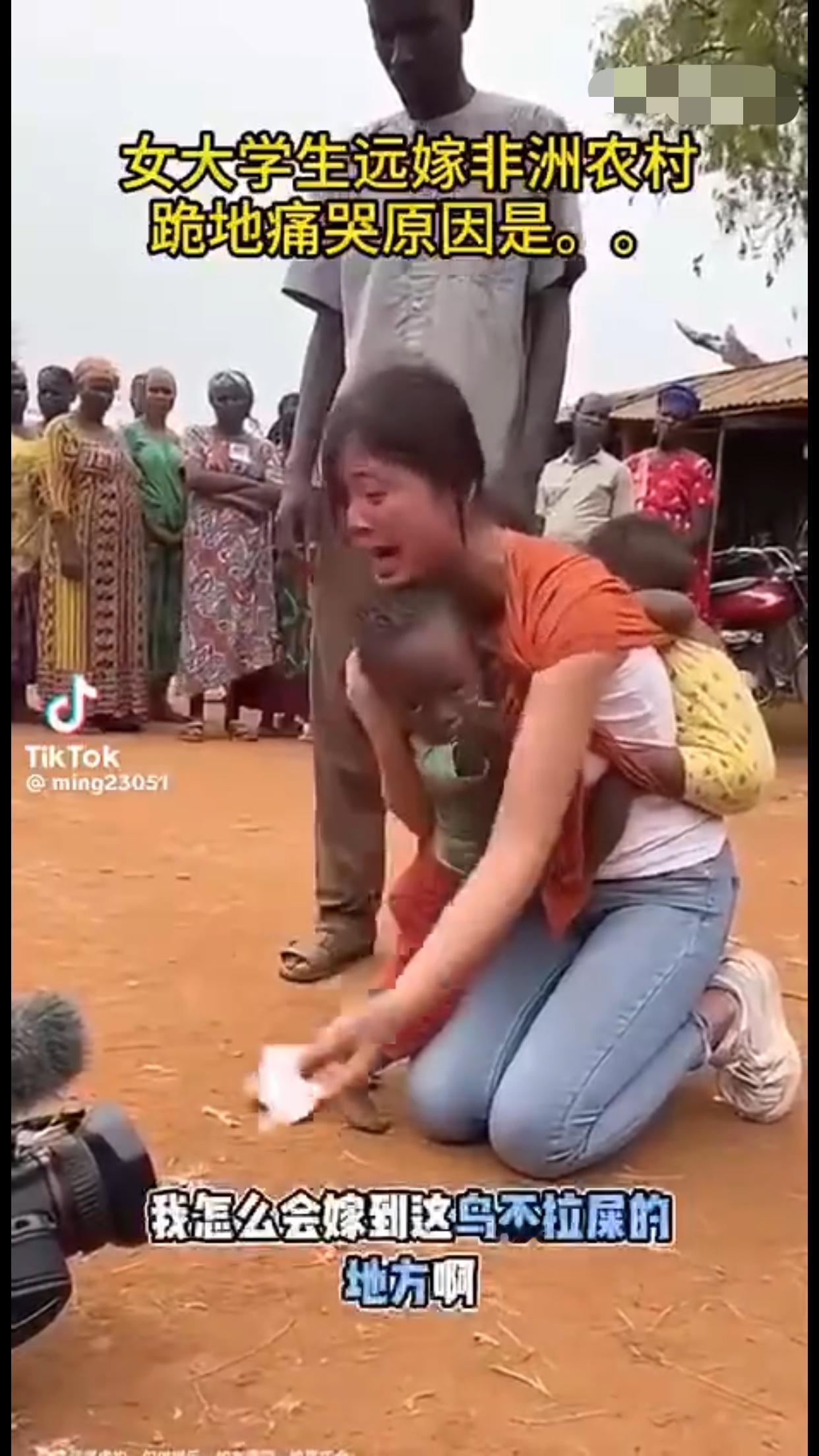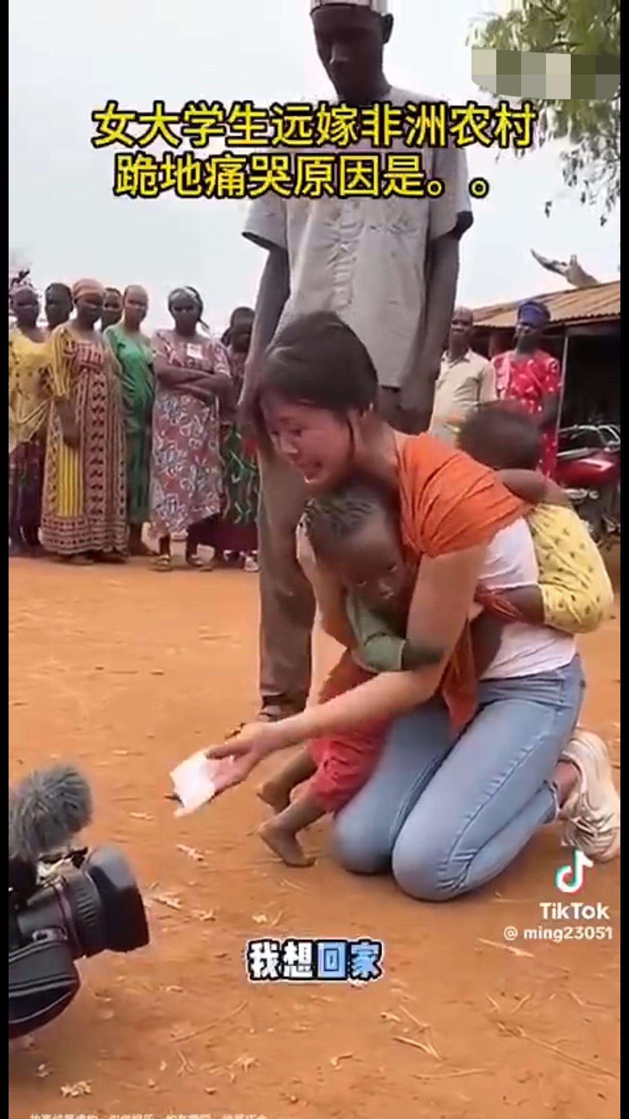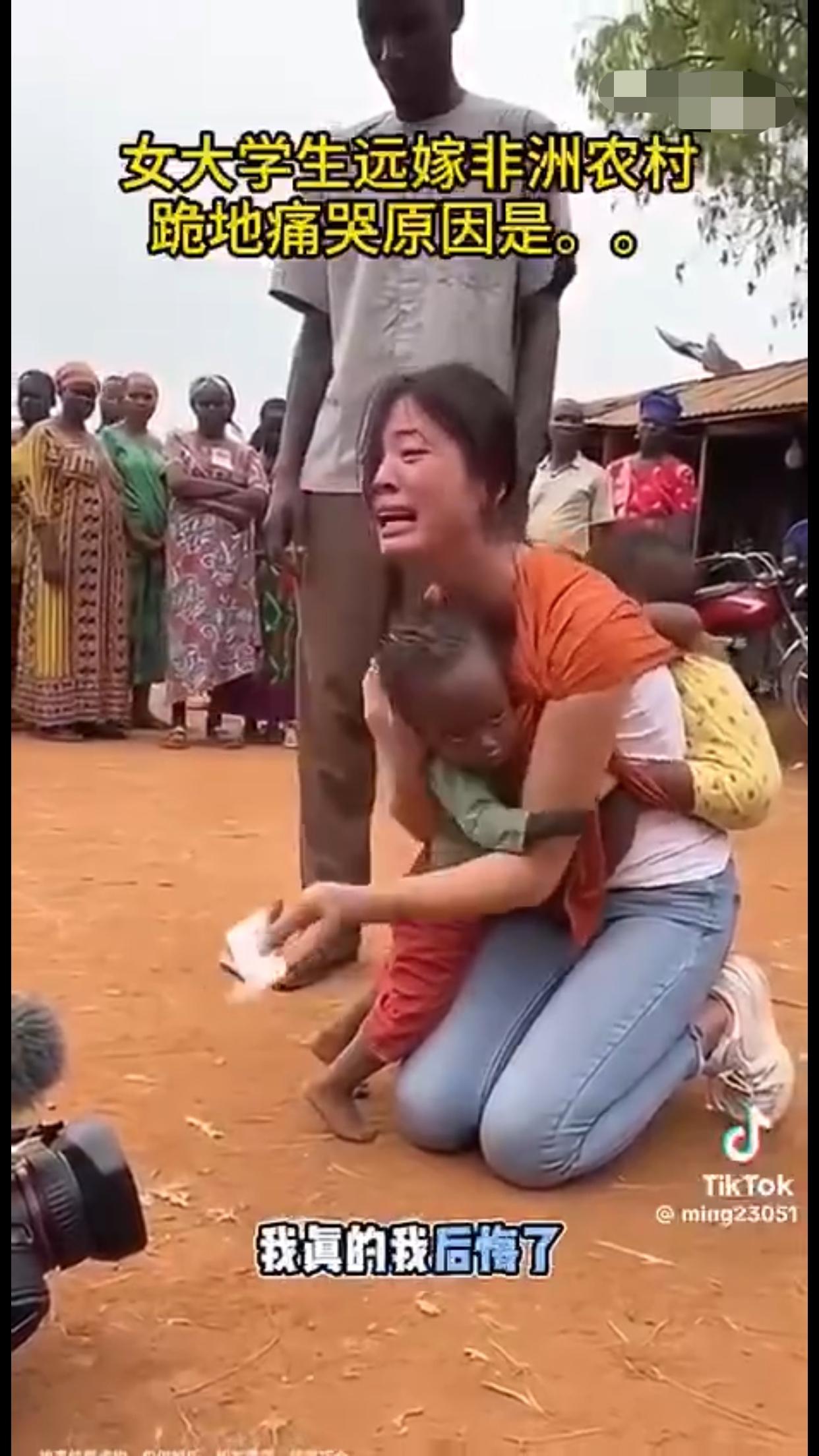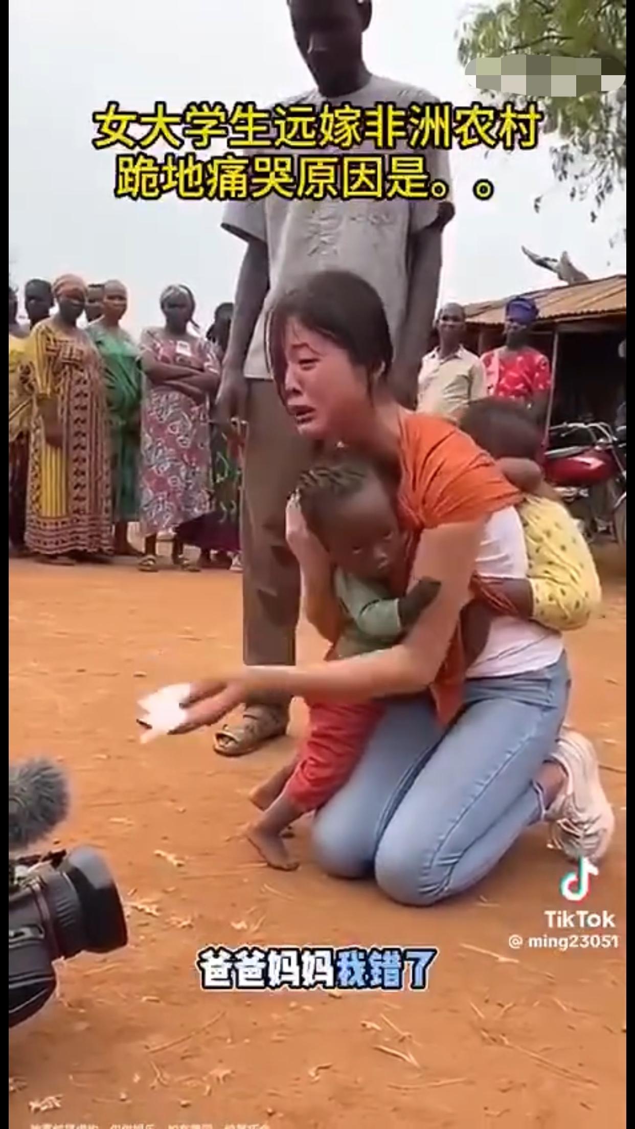 女大学生远嫁非洲农村后,后悔了,背着两个混血黑人小孩跪地痛哭,并向她的爸妈认错,当年没有听他们的劝告,希望远在国内的爸妈能过来非洲接她回家。