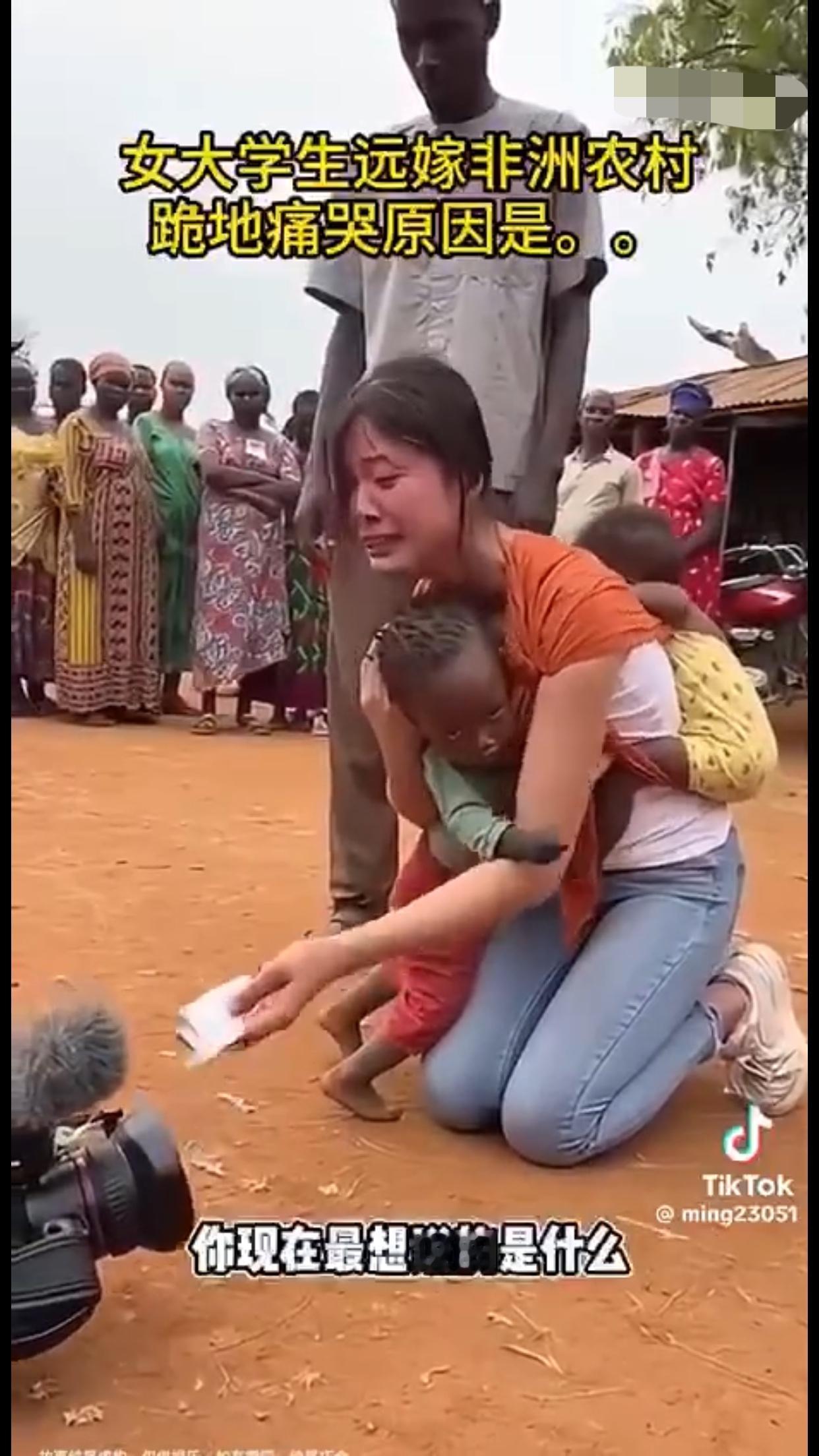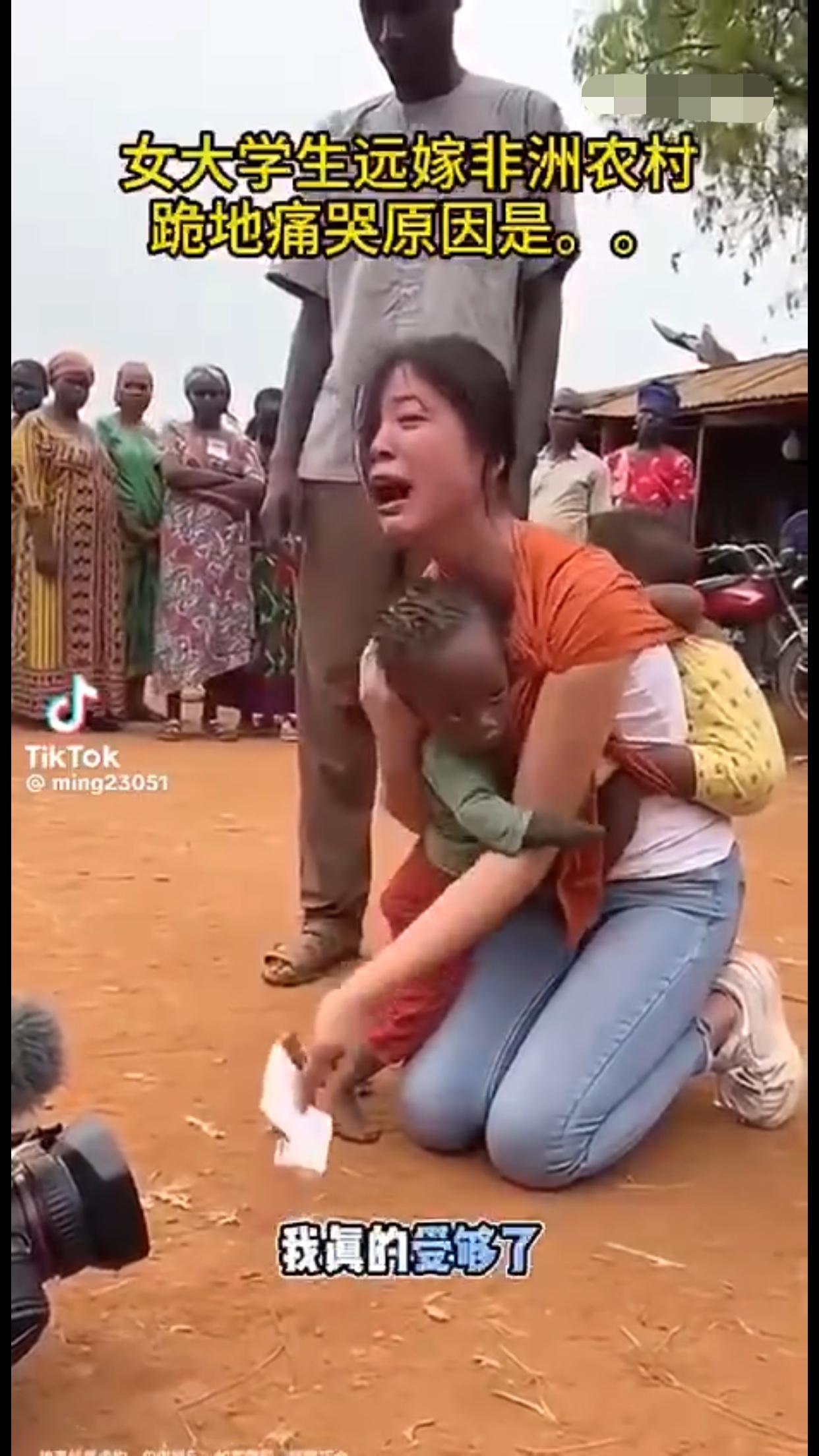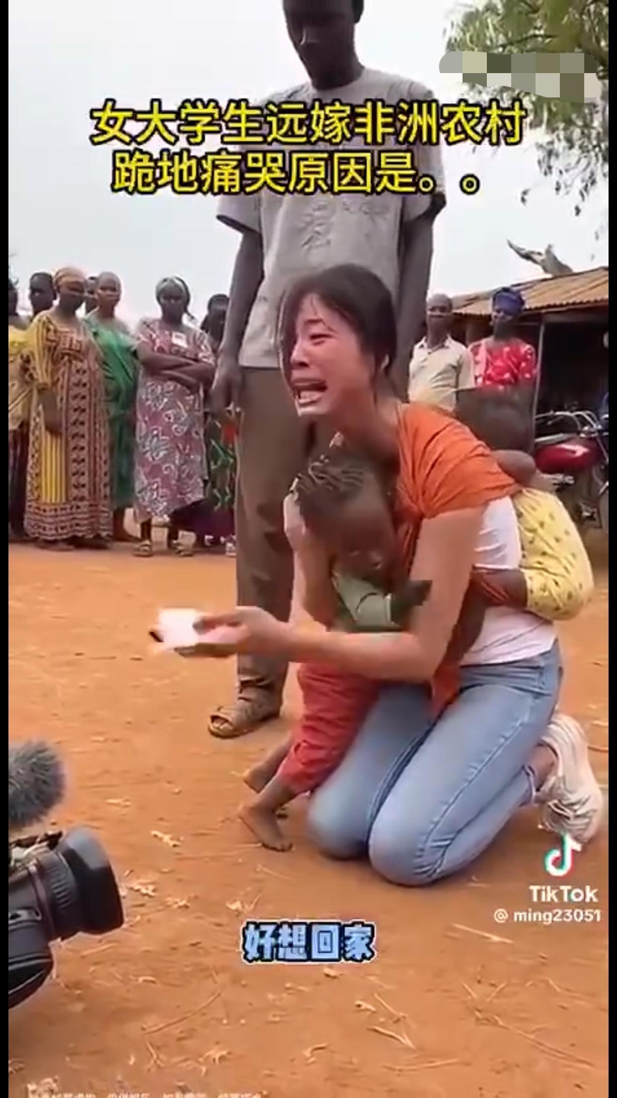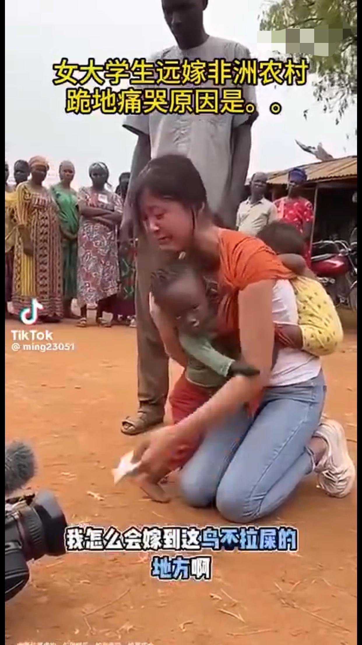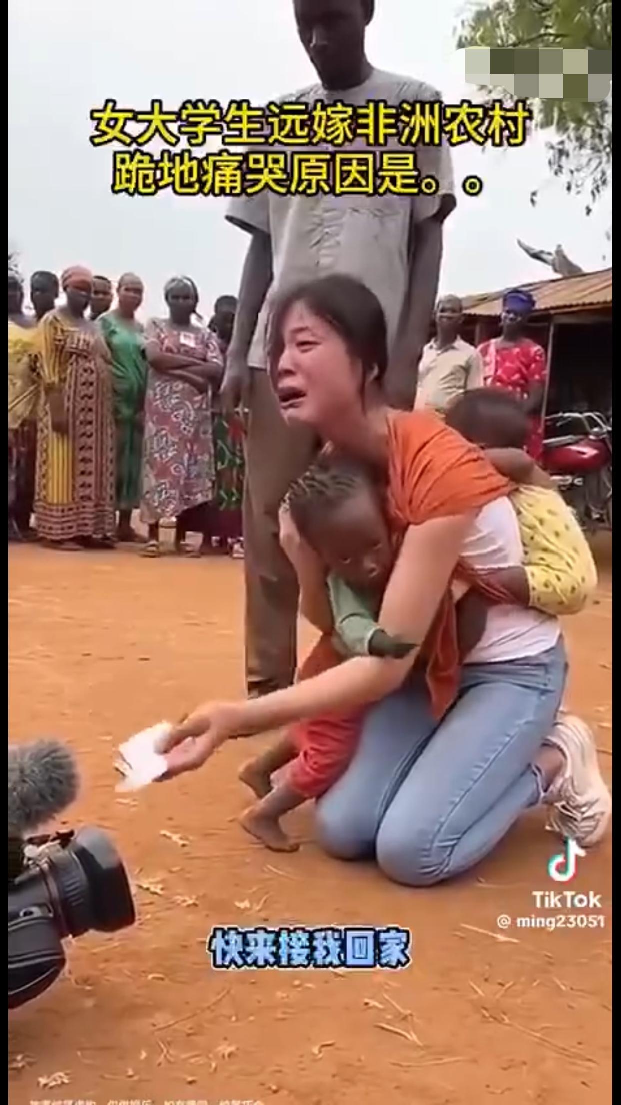 女大学生远嫁非洲农村后,后悔了,背着两个混血黑人小孩跪地痛哭,并向她的爸妈认错,当年没有听他们的劝告,希望远在国内的爸妈能过来非洲接她回家。
