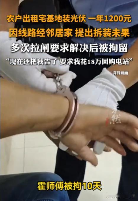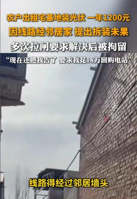 河北廊坊,男子将自家200多平闲置地出租给光伏公司25年,年租金1200元。谁知光伏公司走线时,将线安装到男子邻居家墙壁上。邻居找男子要求拆线,男子联系了光伏公司,但工作人员受理了却不处理,客服承诺会安排人来处理,但也没下文。无奈之下,男子与邻居多次拉闸,试图提醒光伏公司介入。万万没想到,光伏公司居然报了警,使得男子被行拘了10天。更令男子感到气愤的是,光伏公司居然把男子给告了,要求其按照18万元的价格回购发电设备,并要求男子支付相应的违约金。