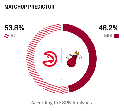ESPN预测明日比赛:老鹰胜率53.8%,热火胜率46.2%