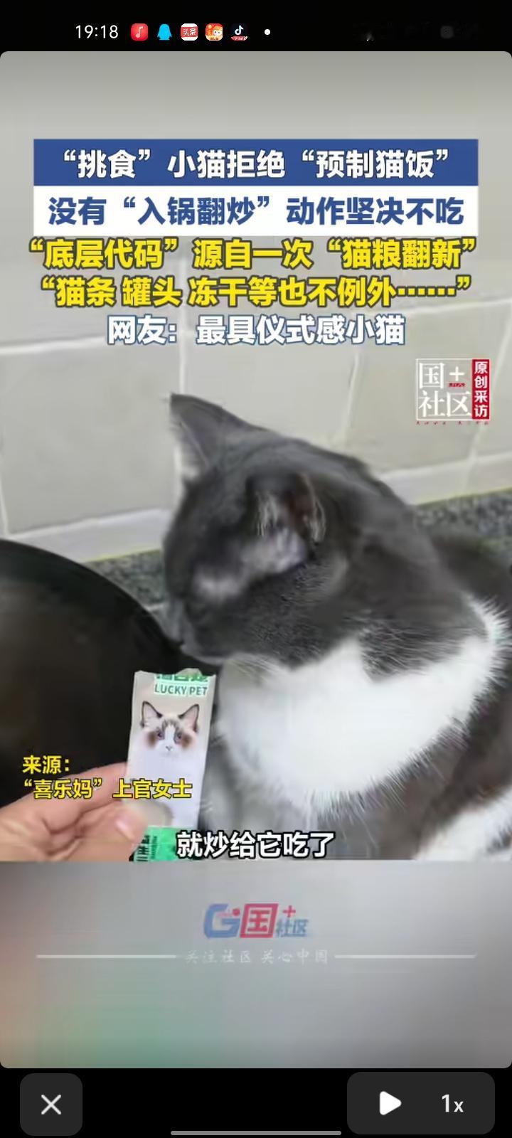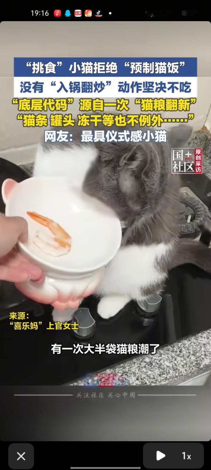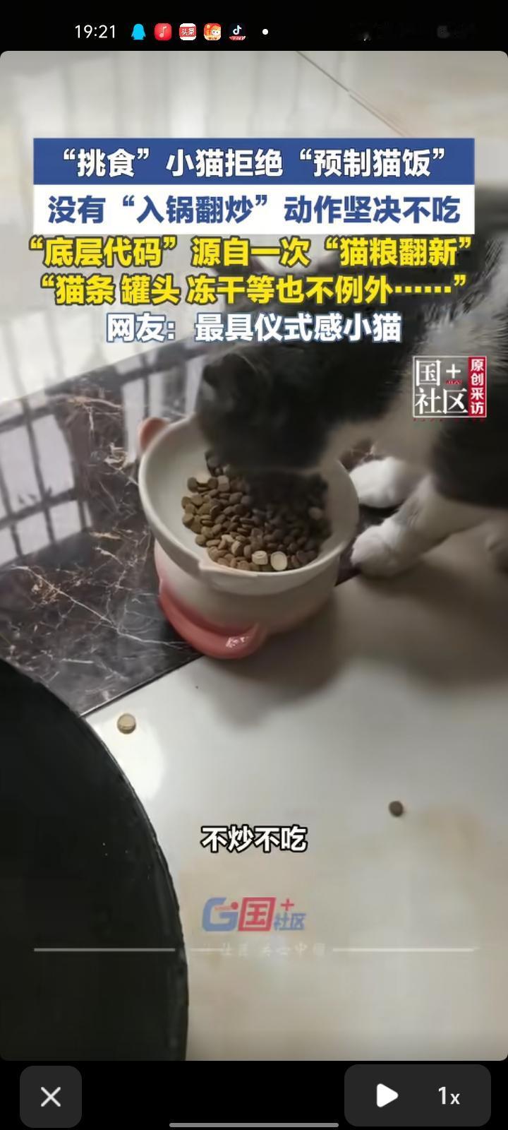 4月12日,河南洛阳。女子发视频称,某天半袋猫粮受潮了就给炒给猫咪吃了,炒了有半个月,之后新的猫粮它也不吃了,之后就没开火给它炒一下。铁锅和铲子是它专属的,不炒的话它不吃,换了厨具还是不吃