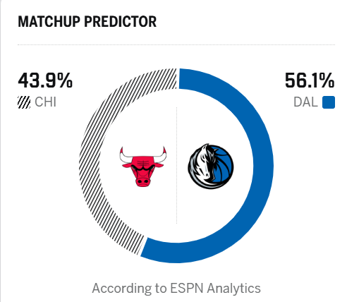 ESPN预测明日比赛:独行侠胜率56.1%,公牛胜率43.9%