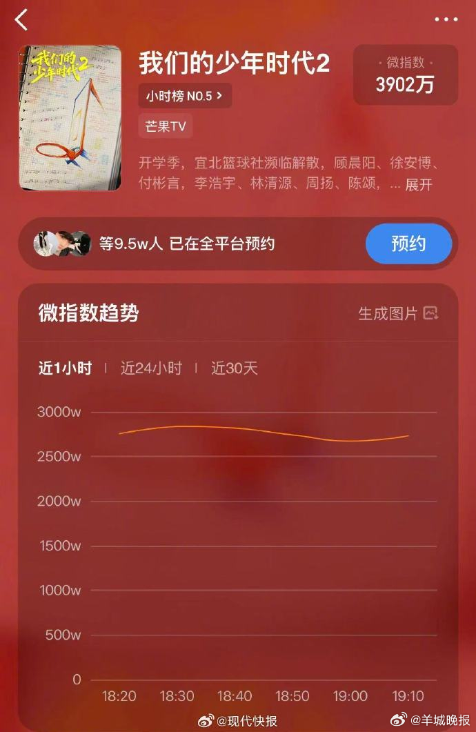 【#我们的少年时代2预约热度飙升#,你期待吗?】近日,TF家族新生代演员(排名不分先后)主演的电视剧《我们的少年时代2》预约热度飙升。该剧预约量呈现爆发式上升——4月1日超6.3万,4月3日突破6.8万,4月5日超7.5万,4月7日超8.2万,4月12日超9.5万。