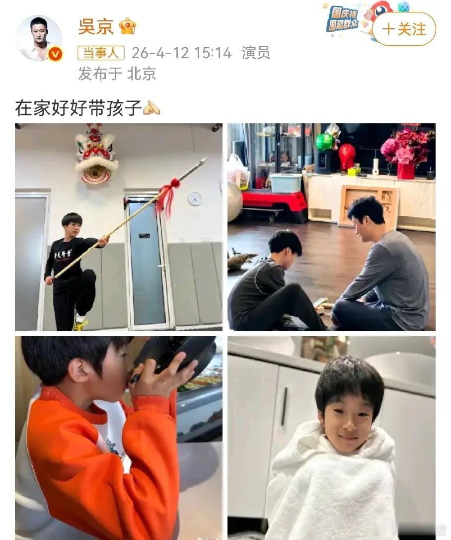 昨天倪萍喊哈吴京照顾好孩子,今天吴京听劝真的带娃了。还晒了一组带娃的照片,和之前节目里的大男子形象完全不一样。照片里这次吴京看起来就是一个普通父亲陪着孩子一起玩游戏。大儿子“吴所谓”手握长枪 摆pos ,小儿子看起来更宠一些,父子三人相处和谐。