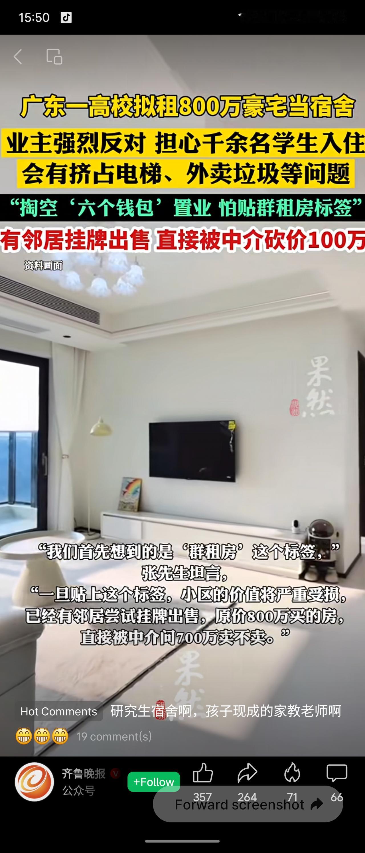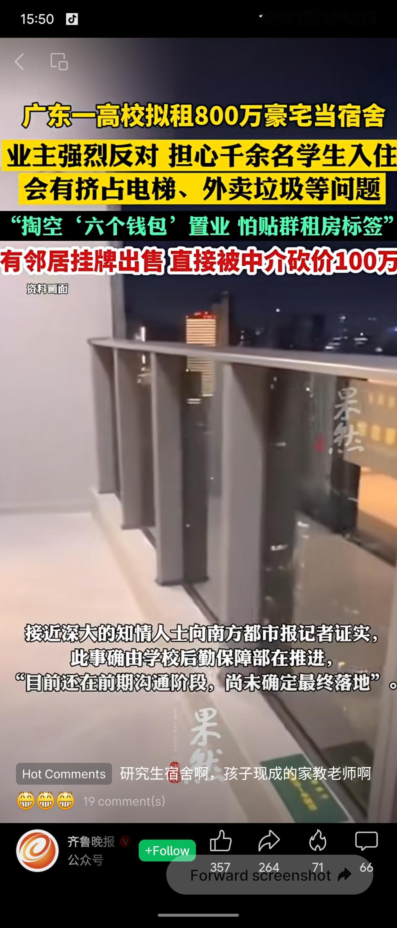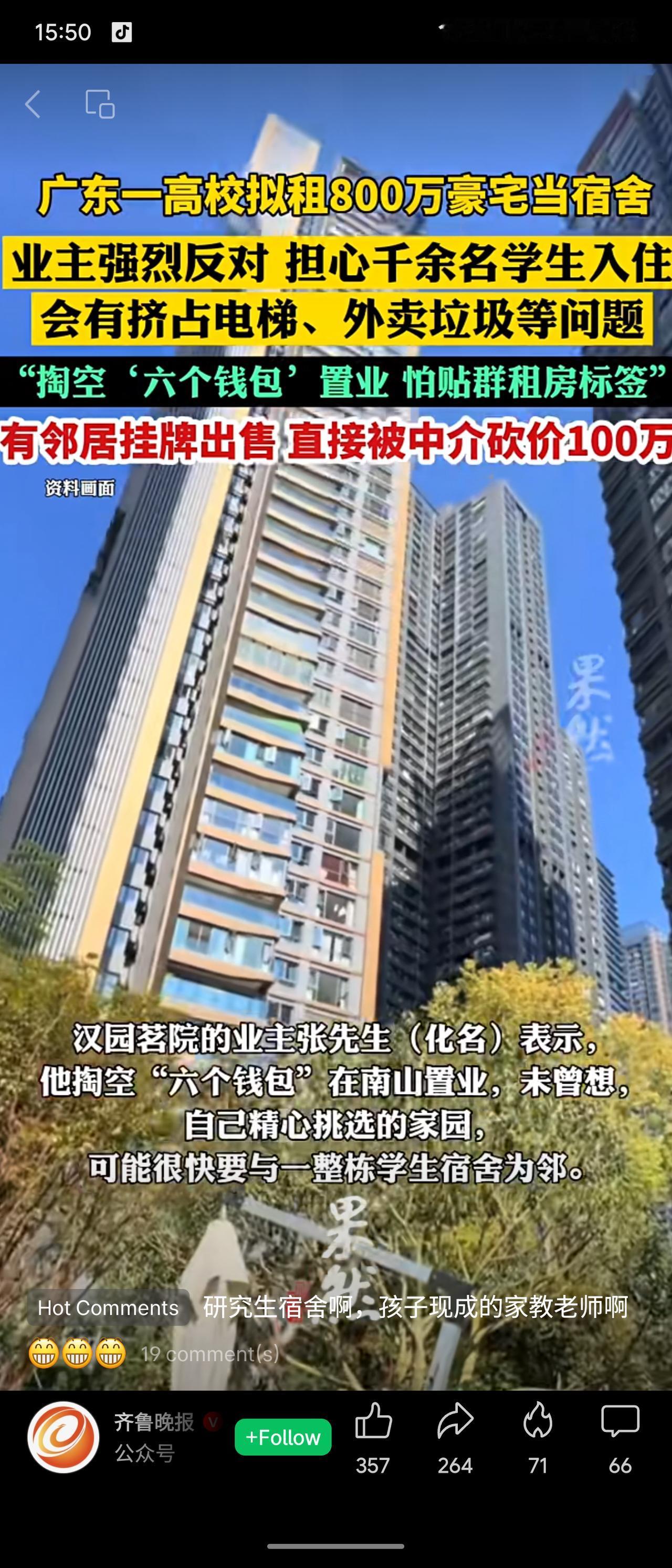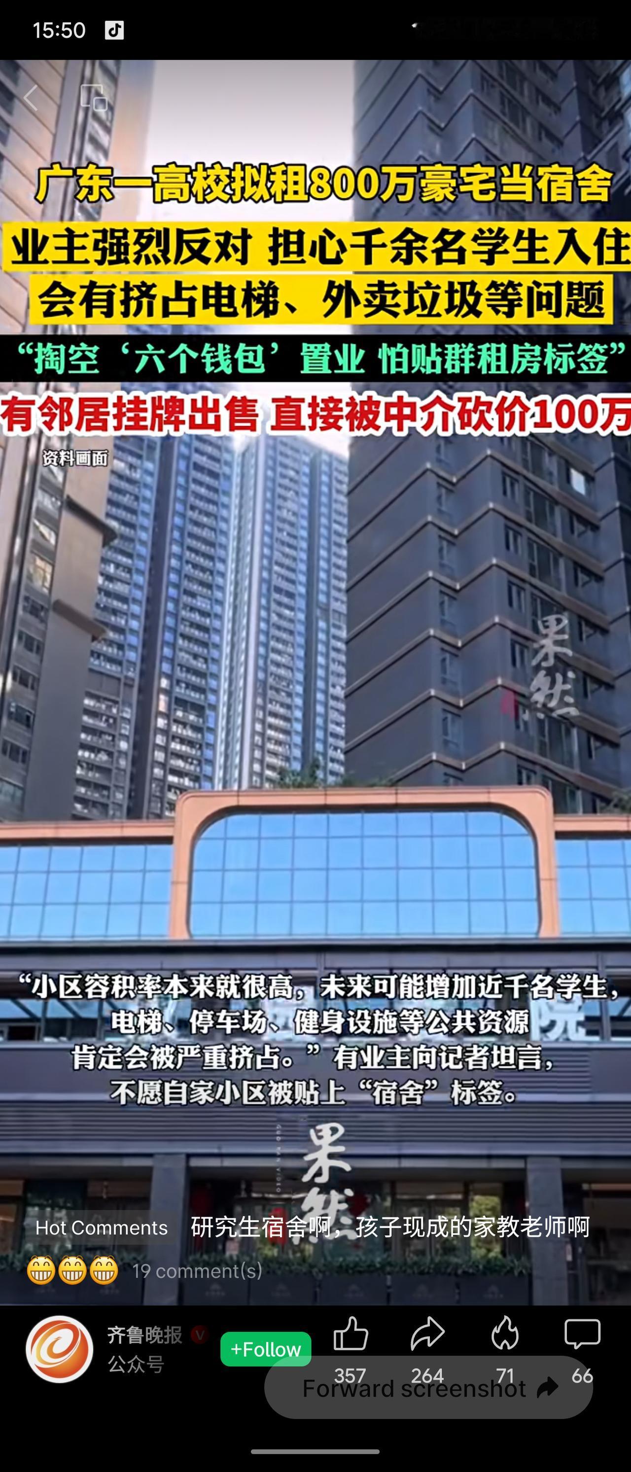 深圳大学拟租用南山豪宅“汉园茗院”(套均800万)作为2026级研究生宿舍,引发业主强烈反对。业主担忧千余学生入住会挤占电梯、车位等公共资源,并给小区贴上“群租房”标签,导致房产贬值。有业主挂牌卖房,甚至被中介砍价100万。校方回应称仍在前期沟通阶段。