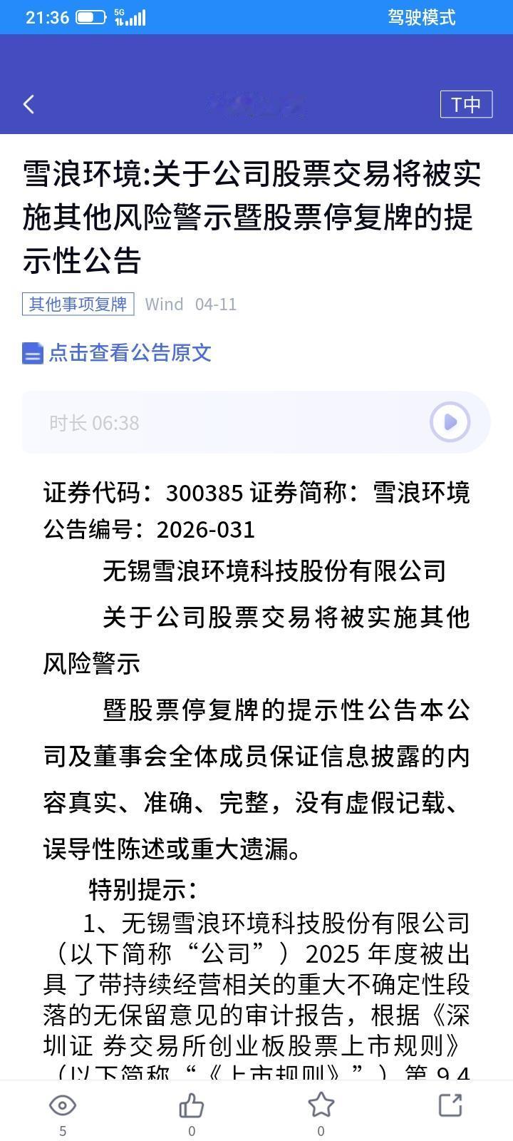 2026.04.12,防不胜防呀,又踩雷了,最近一段时间看雪浪环境多次涨停,让我心动,上周五我趁回落中以15.03元建仓了100股,昨天发公告了,又要st了,真是天雷滚滚,总是踩雷,今年买到好几只股票被st了,每一次都损失惨重,很多人都笑我买得少,赚不到多少钱,这样的环境,动不动就可能踩雷了,而且可能万劫不复,唯一值得庆幸的,只有100股,亏完也就1500块钱。好不容易赚一点点,又要亏进去了,今后还是尽量只做etf了,我选股有问题,经常买到暴雷的股票,经常套在山顶。这次也不知道又要多少个跌停了,悲惨呀。