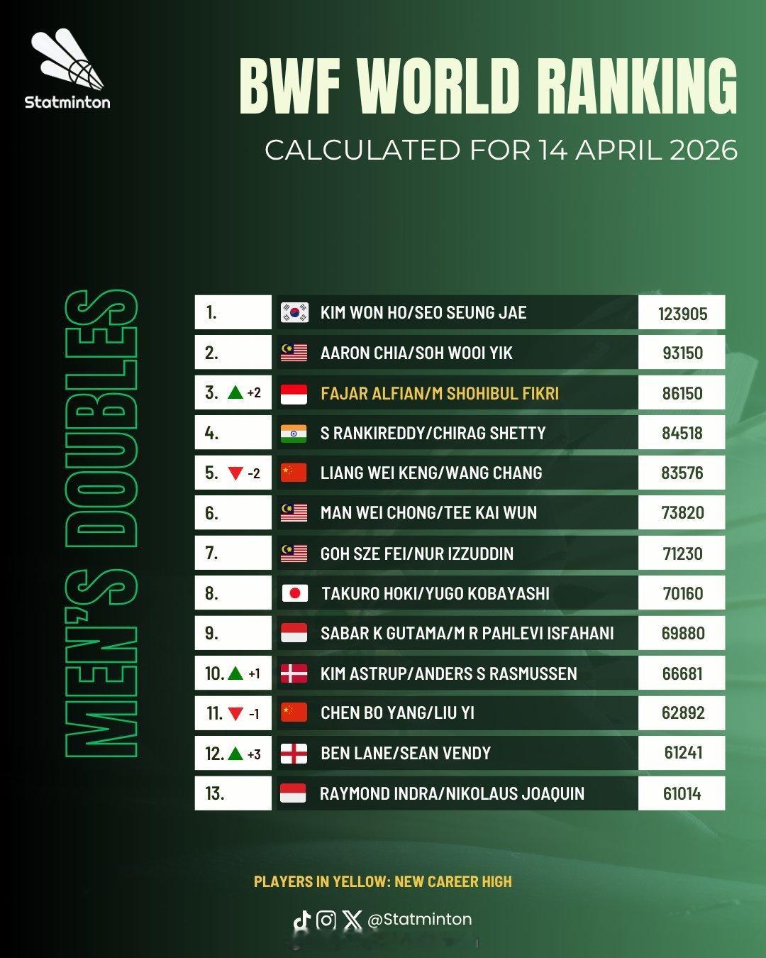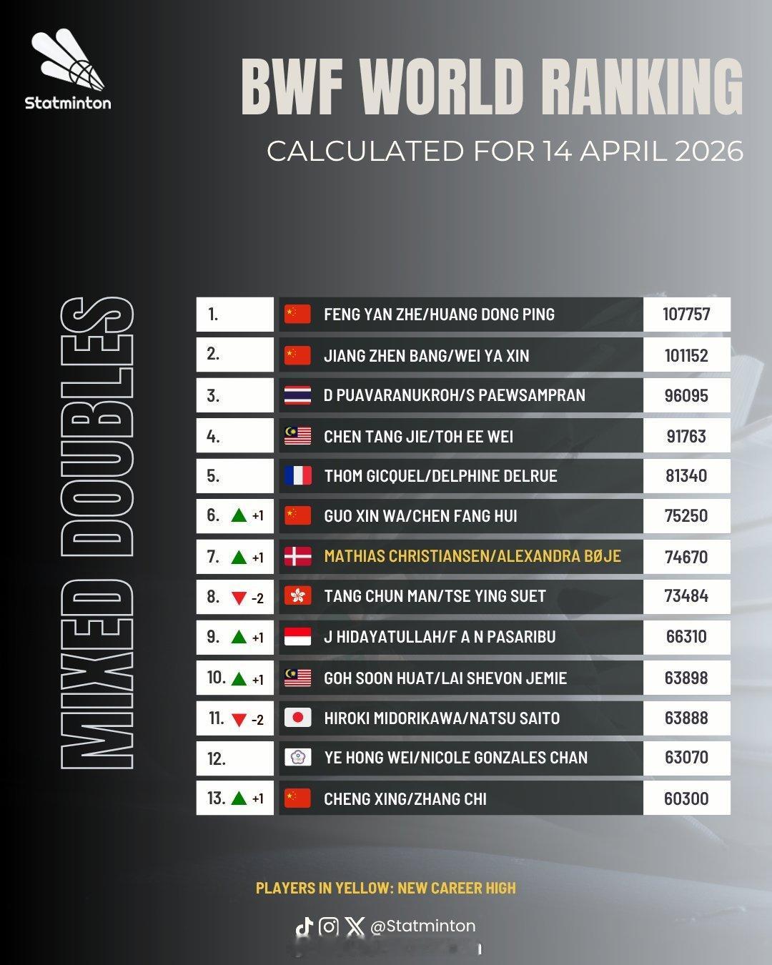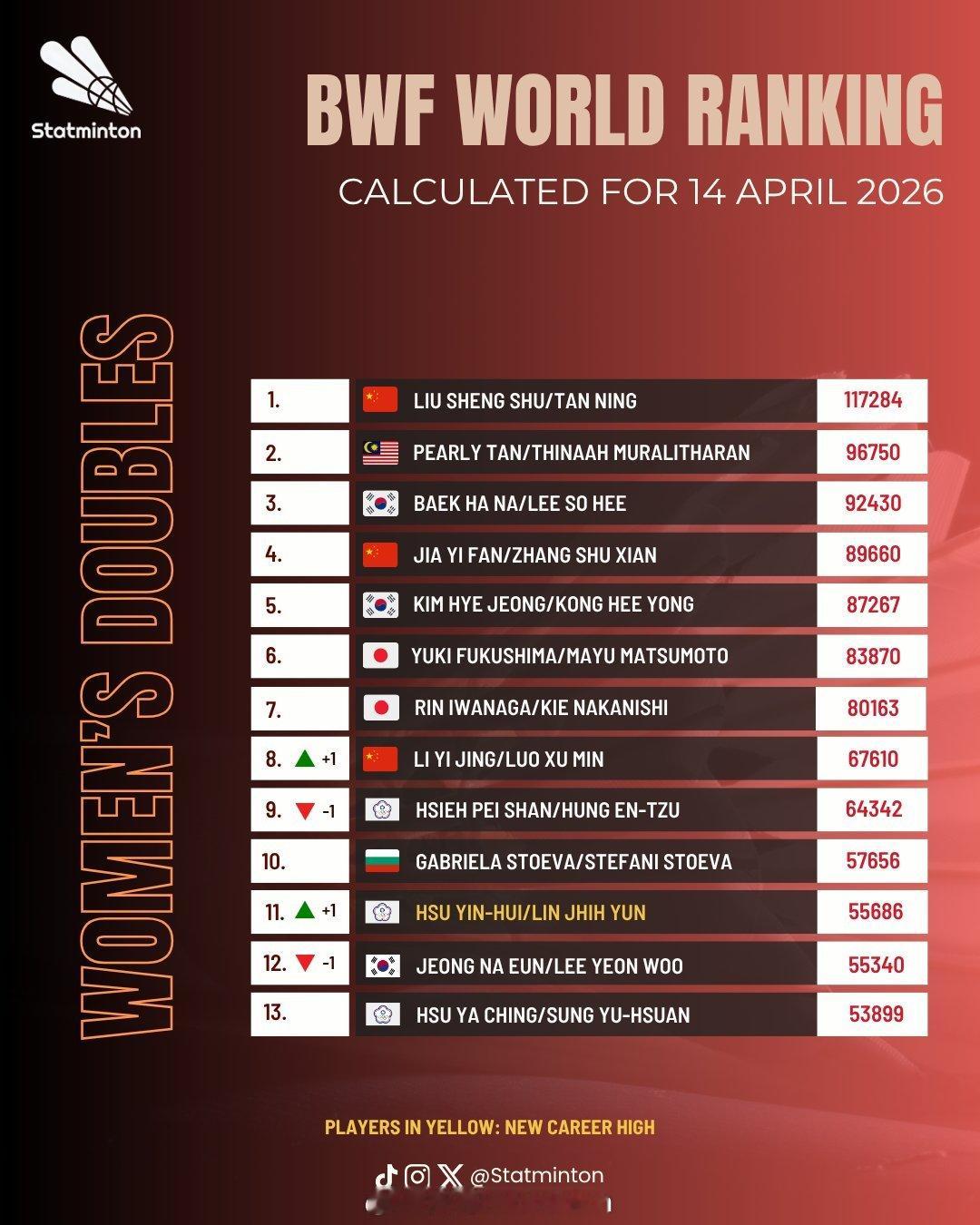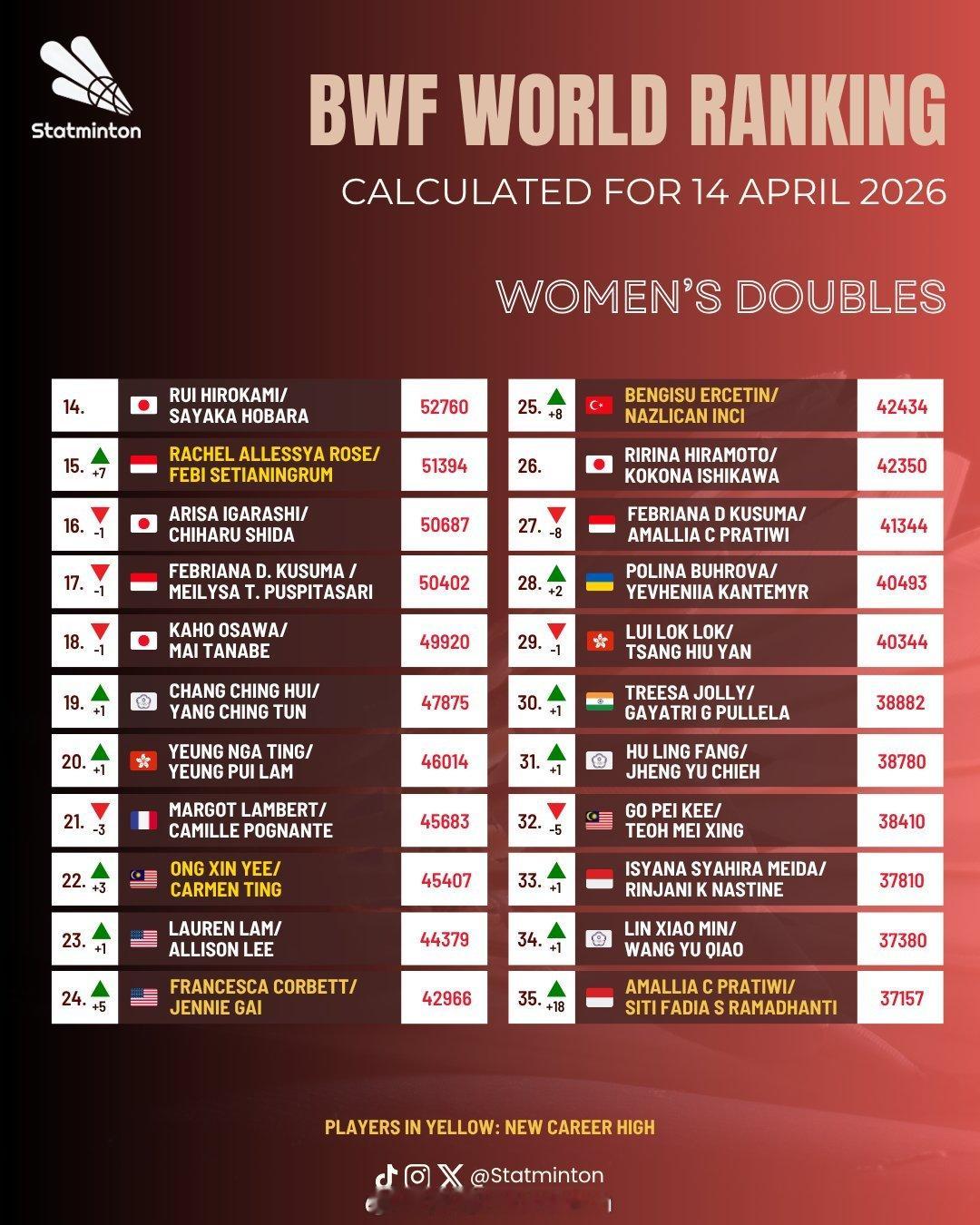 🏸羽毛球各单项最新世界排名🔝(2026.4.14)