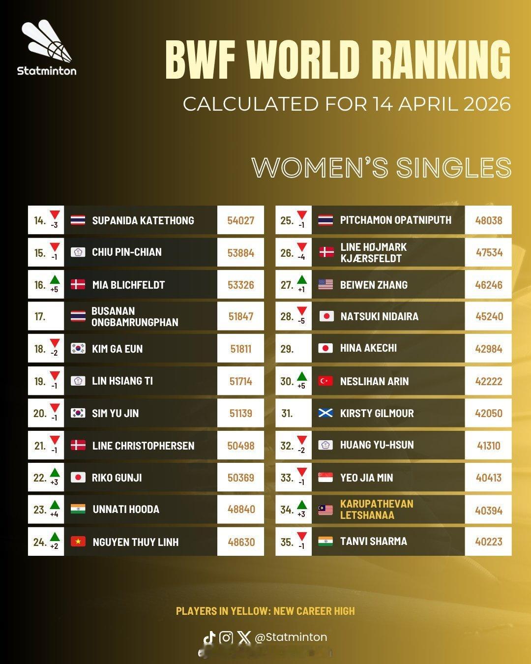 🔝排名部分来源statminton,统计至前35名。★35名以后部分国羽本人独立计算,图中标黄色💛字体为创排名新高,具体排名以每周二官方公布为准,仅供参考!