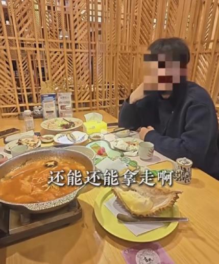 女子先是愣了一下,看了看榴莲,又看了看自己桌上的菜单,慢悠悠说了一句:“我们没点这个榴莲呀。”语气里没有丝毫贪念,看着还挺正常。
