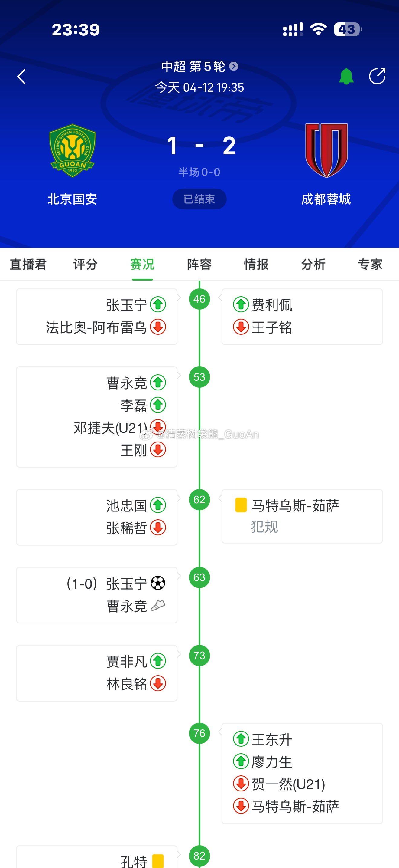 以这场为例,法比奥因伤无法坚持不算,下半场开始5分钟左右,国安基本上完全丢掉控球权了,没记错的话在48-50分钟左右成都连续控球将近3分钟,蒙哥马利或许正是基于此,在下半场开始后仅8分钟后就再次换上2人。虽然替补上场的李磊和曹永竞联袂导演了进球,可球队整体强度上的下降,单靠两个换人是弥补不了了的。再后来被换上场的池忠国和贾非凡基本没什么表现,73分钟便已经用掉了所有换人名额。