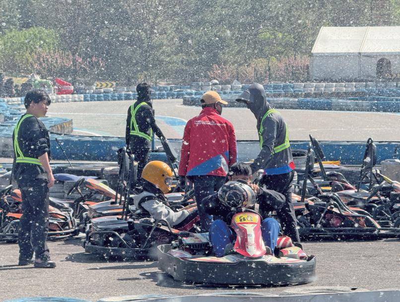 4月11日,新港卡丁车俱乐部(奥森店),年轻人冒着杨柳絮进入赛道准备竞速。新京报记者张鶯摄