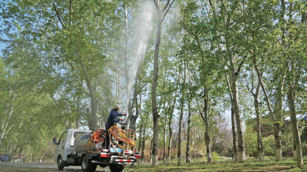 在北京奥林匹克森林公园,园林绿化工人向树木喷施杨柳飞絮凝絮剂。北京市园林绿化局供图