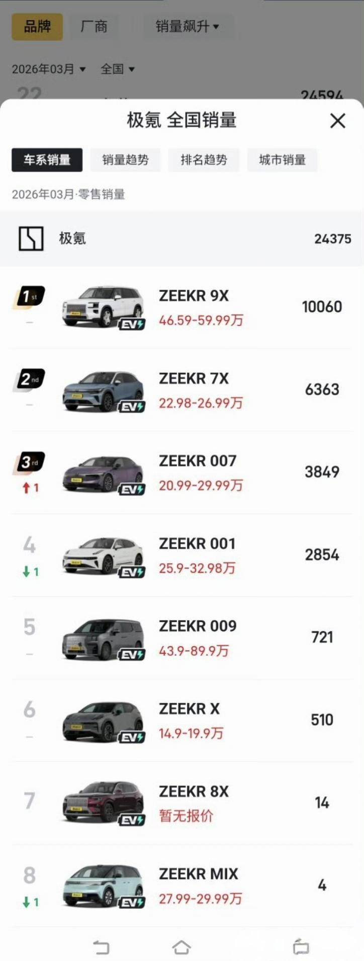 极氪3月销量明细: 极氪9X太强了,仍然是50万级别新能源SUV销冠,实至名归。