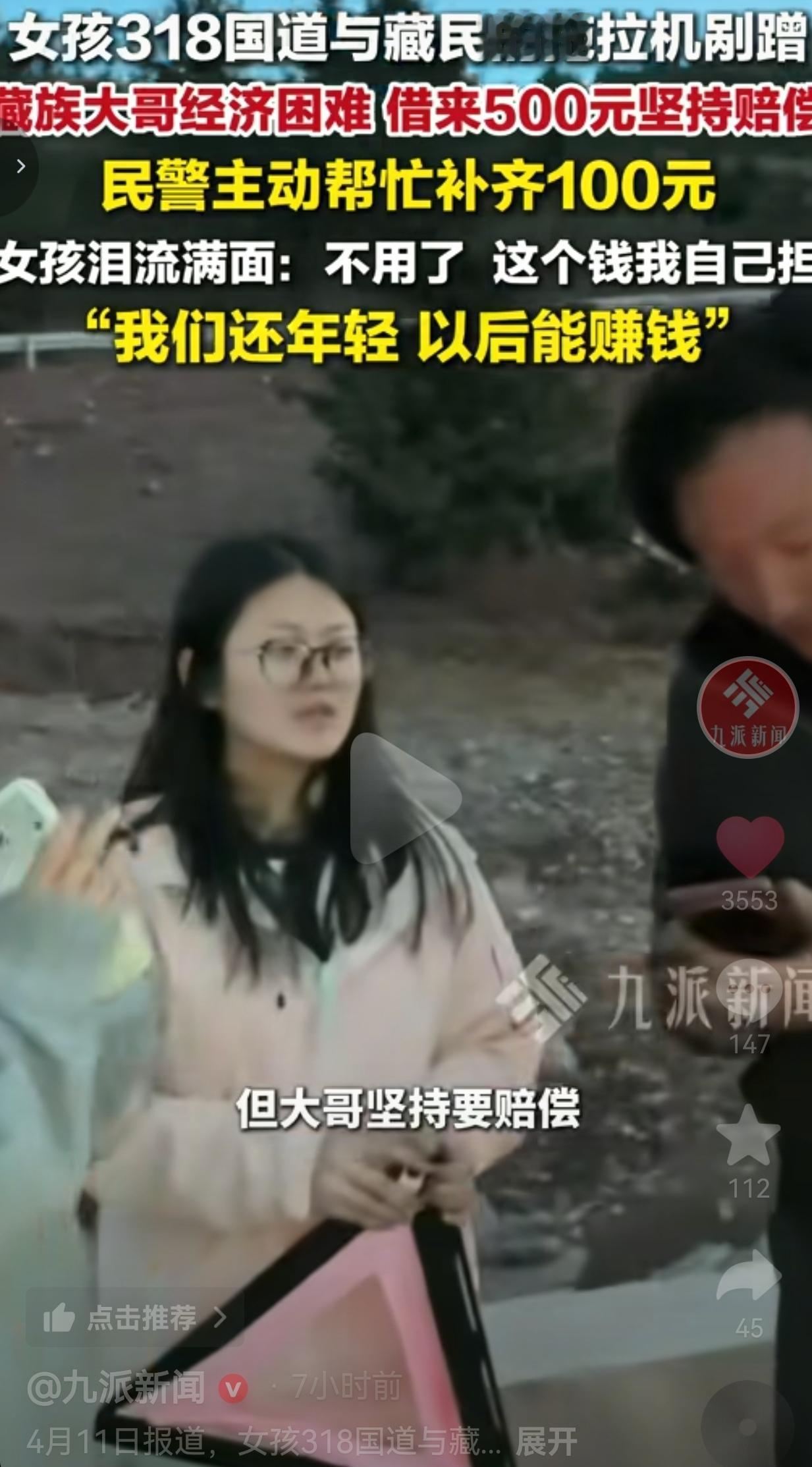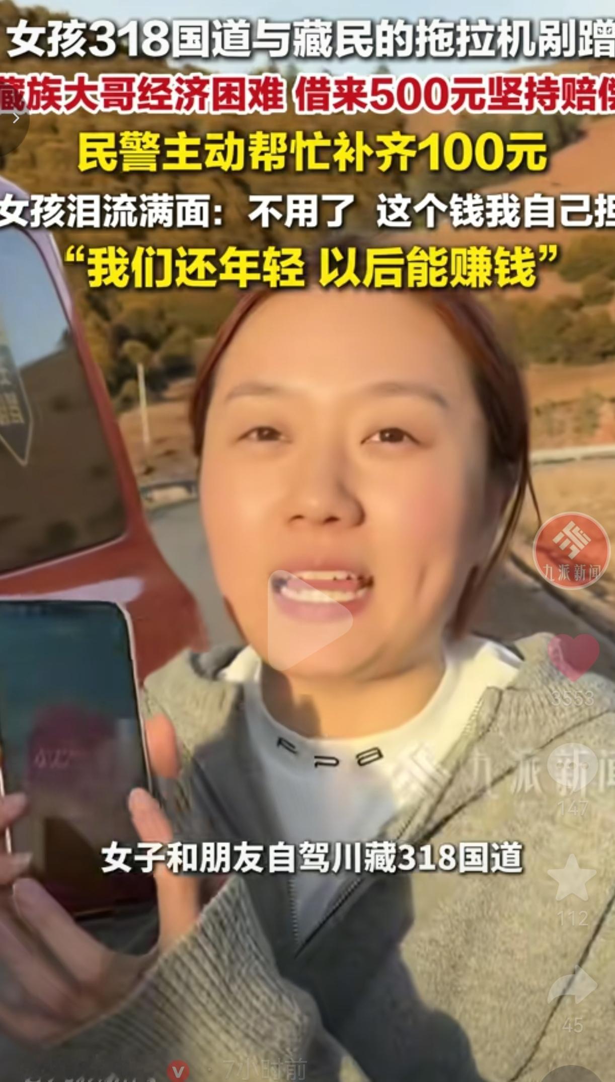 网友看到后评论说:我直接破防!跑了这么多年318,见过太多扯皮的,第一次见这么暖的!大哥借钱也要赔,女孩不要钱,民警补差价,这才是中国人的善良!