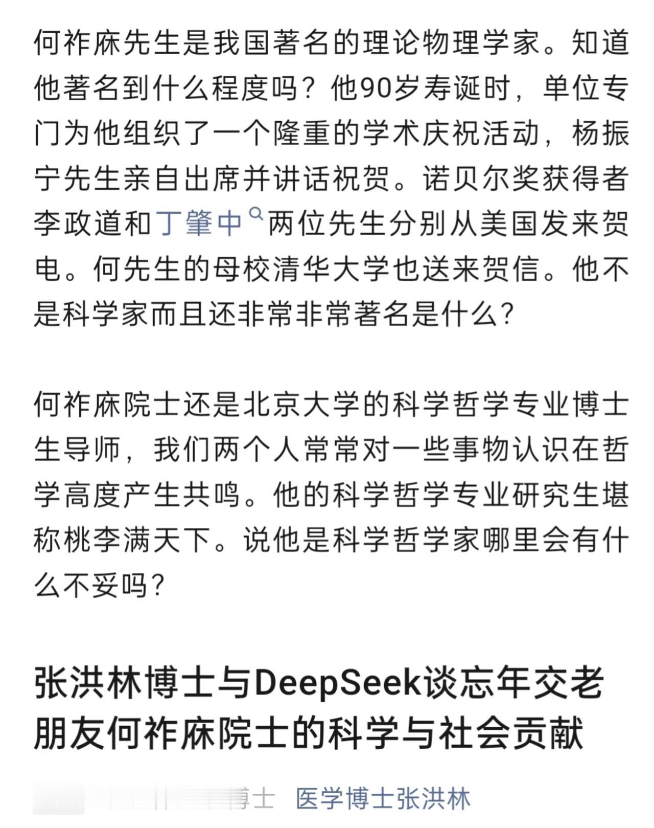 很多网友可能不知道何老院士的影响力。张博士说,就拿何老的90寿诞为例,杨振宁先生亲自出席,李政道和丁肇中先生发来贺电,也就是说三大物理学家都祝贺何老院士。