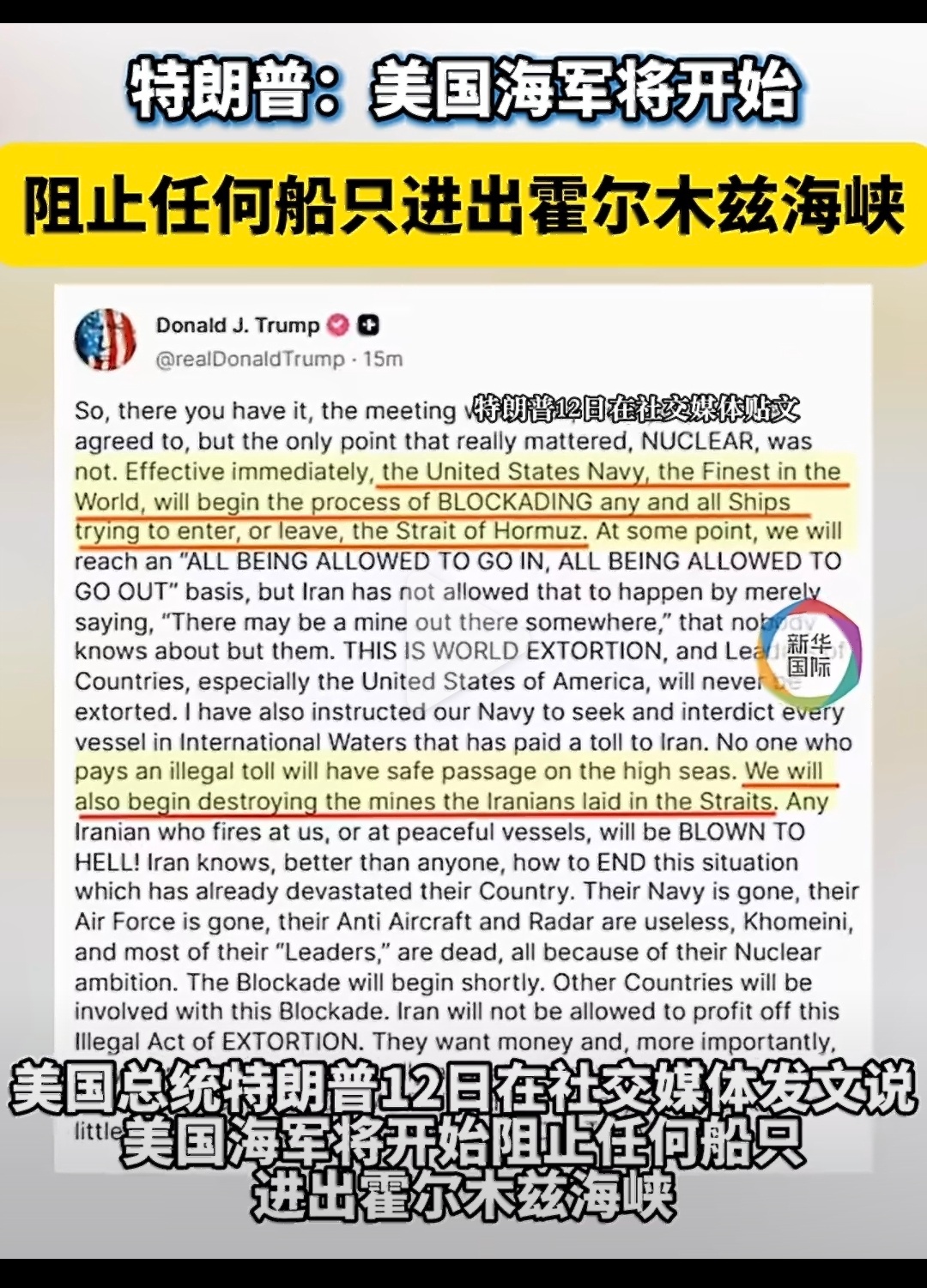 特朗普说阻止船只进出霍尔木兹海峡哈?看来大漂亮和朗子达成的唯一共识就是:一起封锁霍尔木兹海峡!朗子收一道过路费后大漂亮再收一道?