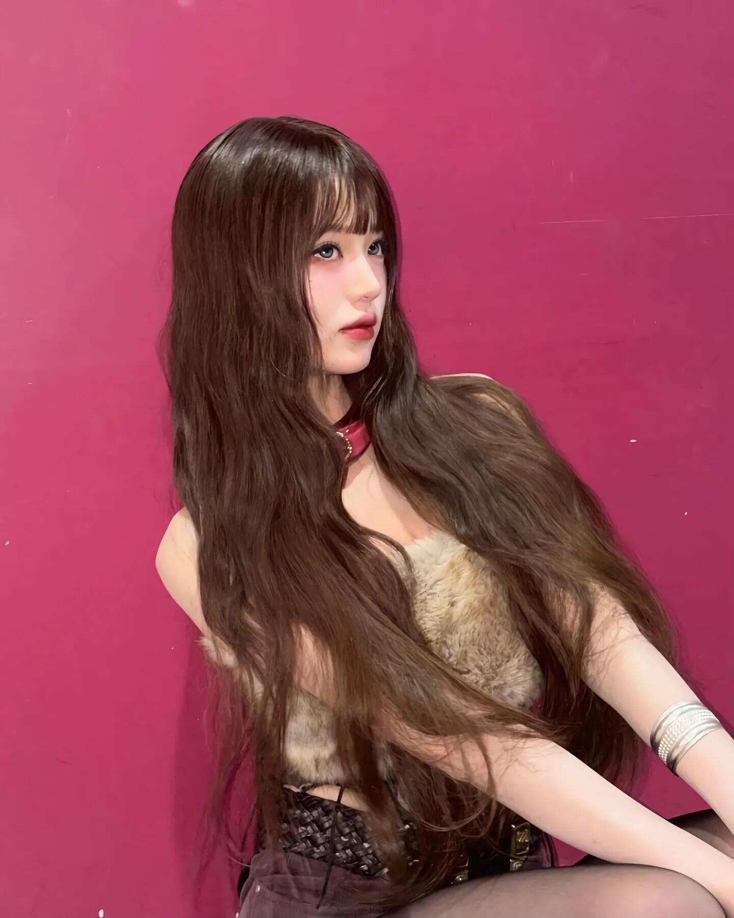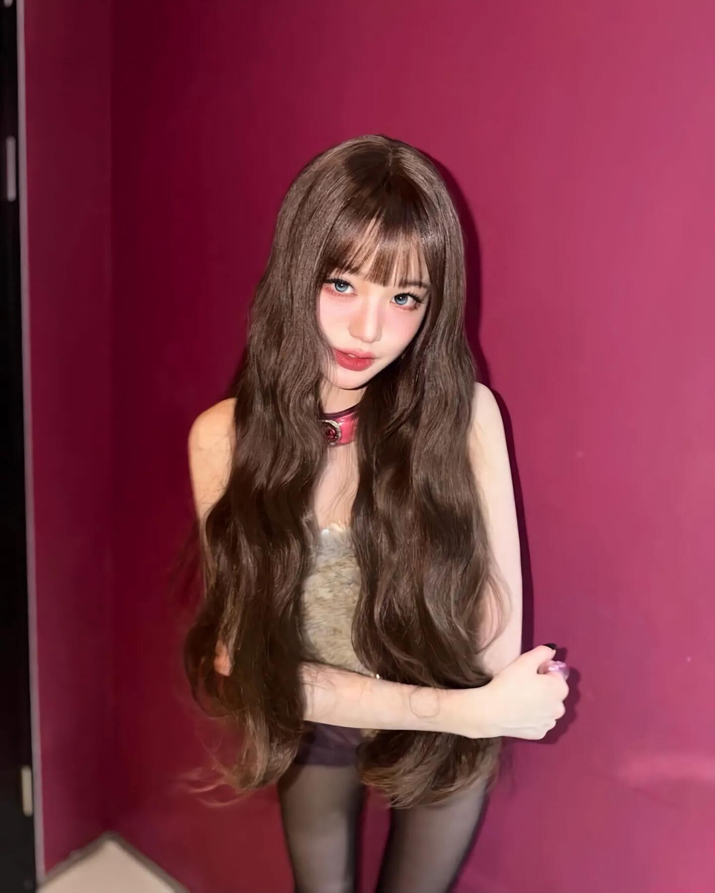 辛芷蕾新造型美炸了!✨酒红真丝V领开衫自带柔润光泽,搭配斜纹花呢半裙,红棕撞