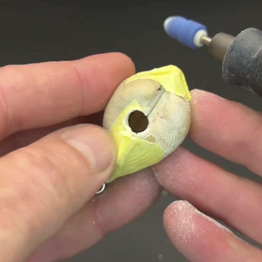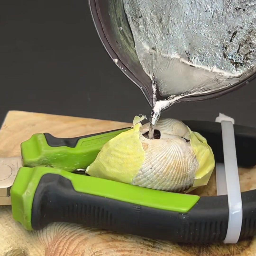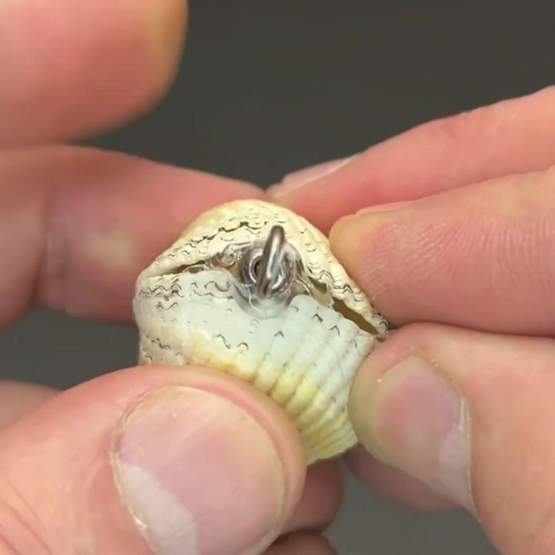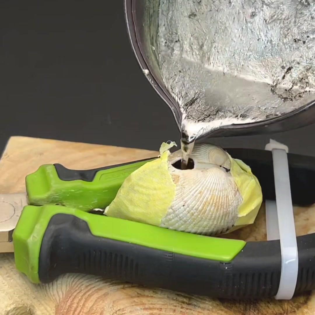2️⃣铅皮包裹贝壳:用铅皮紧紧裹住贝壳,尽量让重量均匀,接口处用剪刀修整平整,确保铅坠整体能保持平衡。