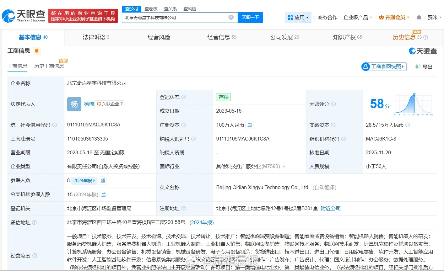 记者查询天眼查发现,哩布哩布AI关联公司北京奇点星宇科技有限公司成立于2023年5月,经营范围包括服务消费机器人制造、工业机器人制造、工业机器人销售等,由陈冕、北京奇点星辰企业管理发展中心(有限合伙)共同持股。变更记录显示,去年11月,张子捷卸任该公司法定代表人、经理,陈冕卸任董事,杨楠接任法定代表人、董事、经理;去年5月,该公司注册资本由约129万人民币减至100万人民币。