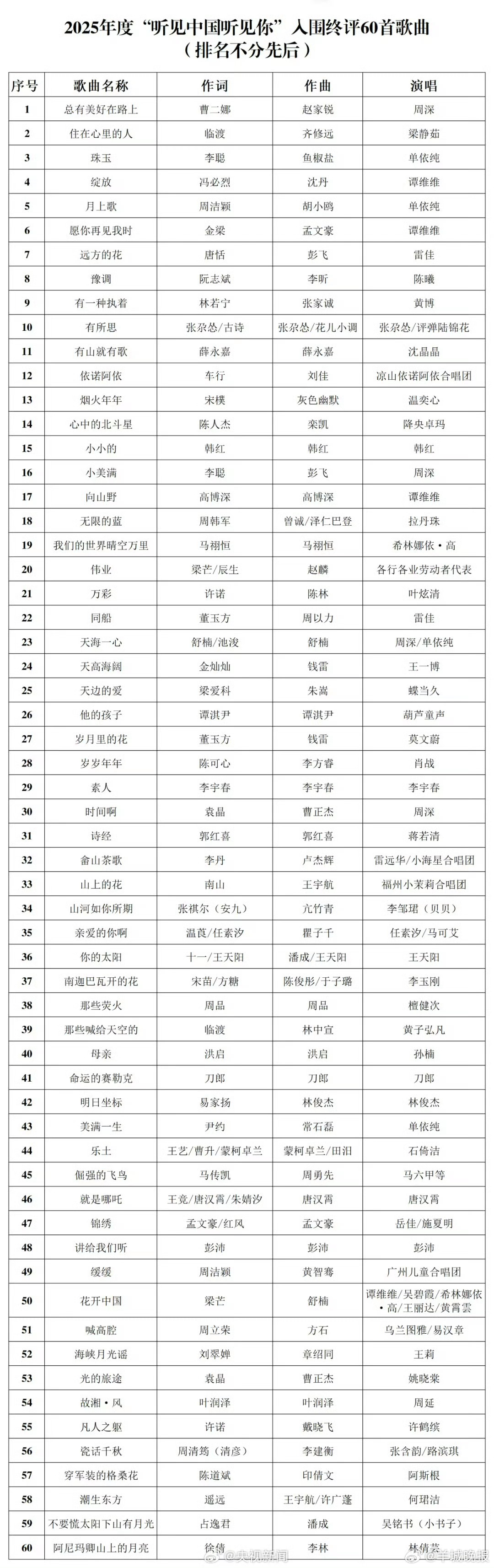 #60首歌入围年度优秀歌曲#【转发推荐!2025优秀歌曲入围名单】近日,中国音乐家协会公布“听见中国听见你”当代歌曲创演活动——2025年度优秀歌曲推选复评结果公示。你最喜欢哪首歌?评论区聊聊↓↓更多消息:#李楷灿 抓猪##霍思燕最争气的是她自己##曝田曦薇司机和粉丝发生冲突##李楷灿 恋爱##徐艺洋竟然和孙怡合作过##李楷灿打游戏##十日终焉防代拍##陈赫 短剧#(编辑:惠天骄;审签:艾渝)