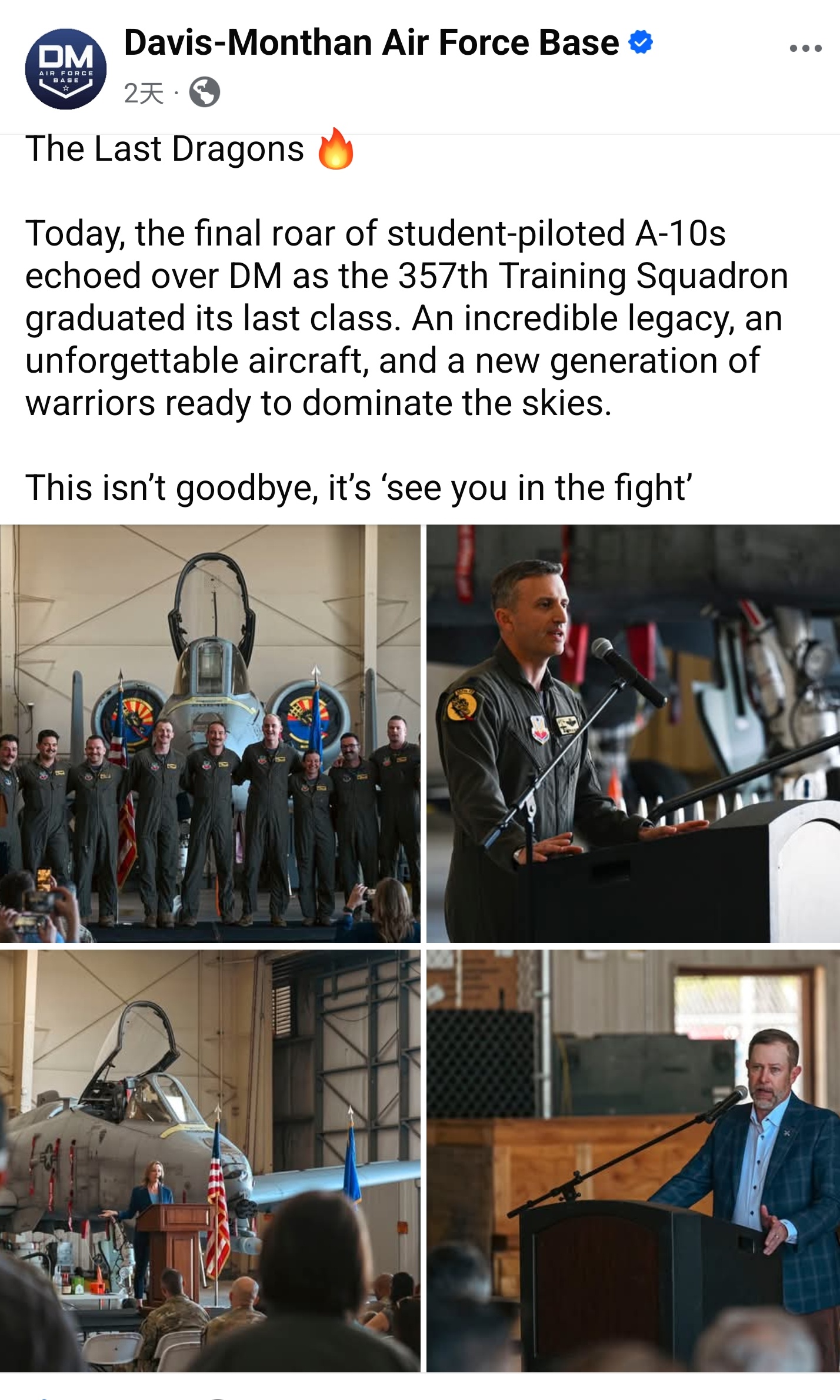 最后一批A-10“疣猪”攻击机飞行员毕业,4月3日,美国亚利桑那州戴维斯-蒙森空军基地MD二等人第357训练中队举行最后一批A-10飞行员学员毕业典礼,标志着该基地作为二等人唯一A-10 正式飞行员训练基地的时代正式结束,此次毕业后,该中队将于 5 月 1 日举行最后一次 A-10 实弹训练,随后逐步撤编 A-10 机队, 飞行员将转训 F-35A 等新平台。军事ai新视野