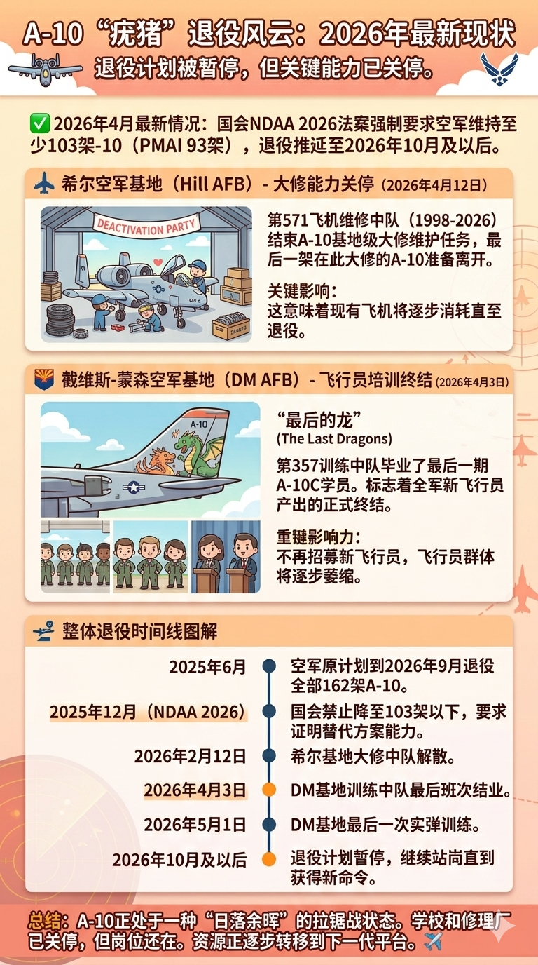 最新官方表态(2026年4月):多处二等人相关消息明确表示“A-10 将继续作为关键资产服役至2026年10月,退役计划暂停待进一步通知”全球武器装备盘点