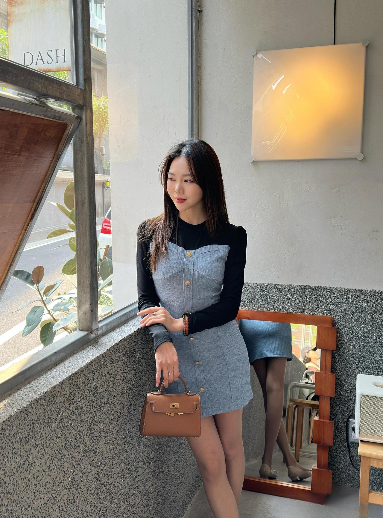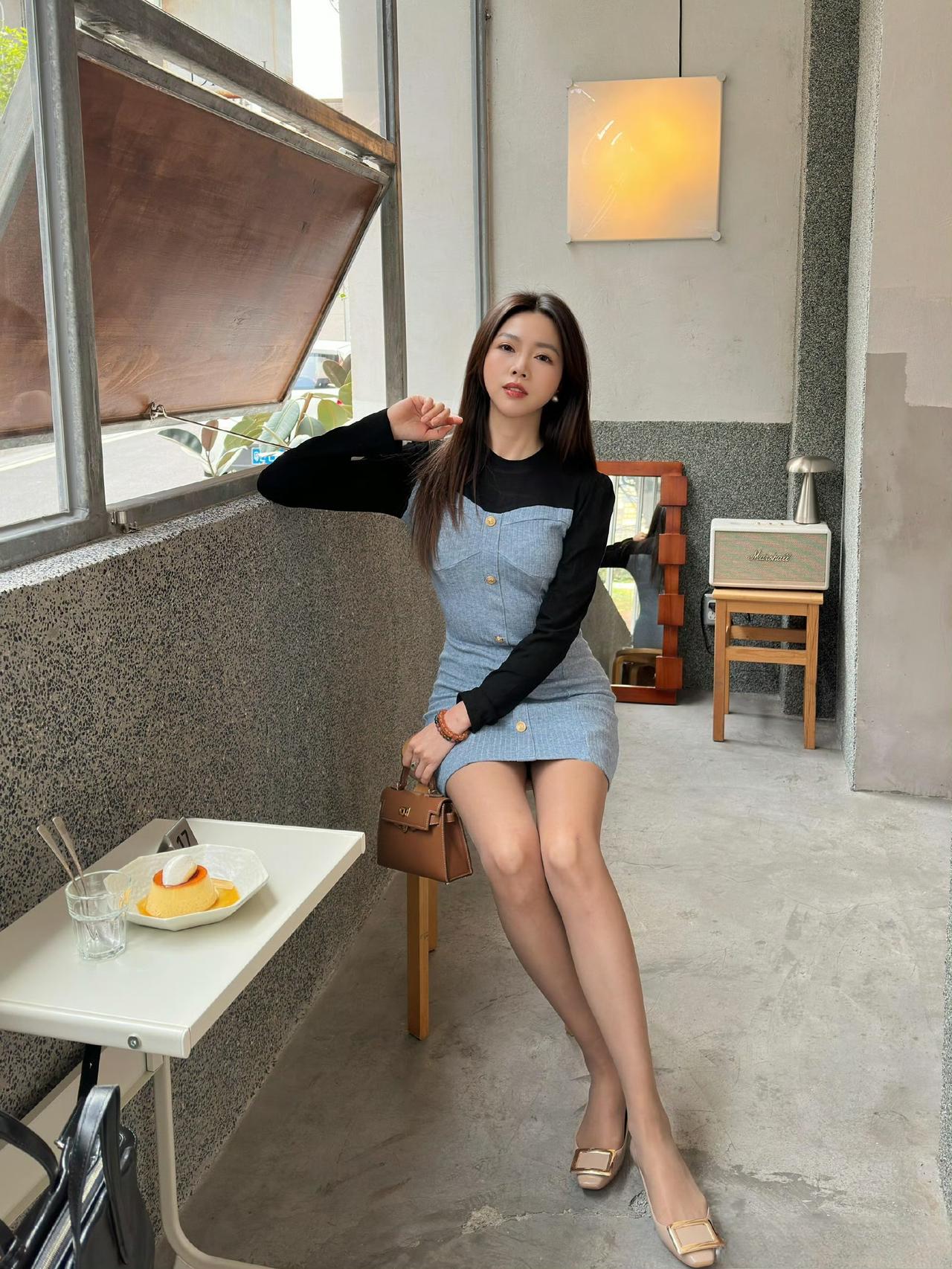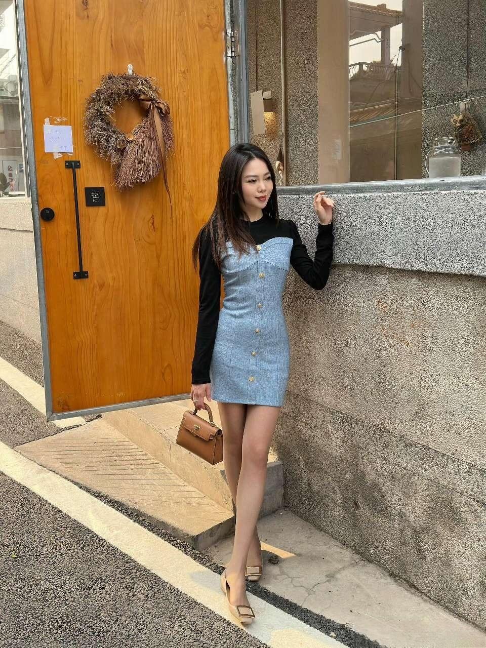 - 单品选了黑蓝拼接牛仔连衣裙,黑色长袖+牛仔吊带的拼接设计,既保留了甜美元素,又增加了酷感;排扣+修身版型显身材,短款长度利落显腿长;