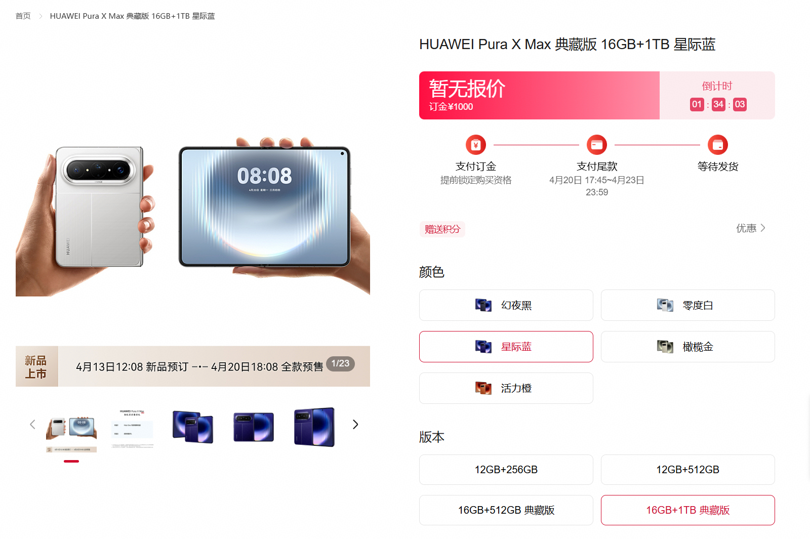 华为PuraXMax今日开启预订华为大阔折真的要来了!华为 Pura 系列及全场景新品发布会官宣定档 4月20日亮相,华为Pura X Max也已正式开启预订。作为全球首款大阔折,这次不只是新品亮相,更是折叠屏形态的一次全新打开方式。“大阔折,太阔了”的观感非常直给,外观辨识度一下就拉满。在日常使用、商务办公、影音娱乐等多场景中,实现体验全面跃升。华为大阔折5款配色这次同步释出的五款配色也很有记忆点:零度白、星际蓝、活力橙、橄榄金、幻夜黑,从先锋拼接到极简高级,各有各的气质。其中星际蓝尤其吸睛,质感和工艺都很有看头。那么大阔折盲猜时间到!影像会不会上二代红枫?芯片会不会迎来大升级?在行业内存大涨价的情况下,推出全新旗舰形态,对标华为Mate X7,预估价格在1.2w+,你觉得这次会定多少?如果你也在关注折叠屏新形态,可以先去预订通道蹲一波,坐等 4 月 20 日正式亮相