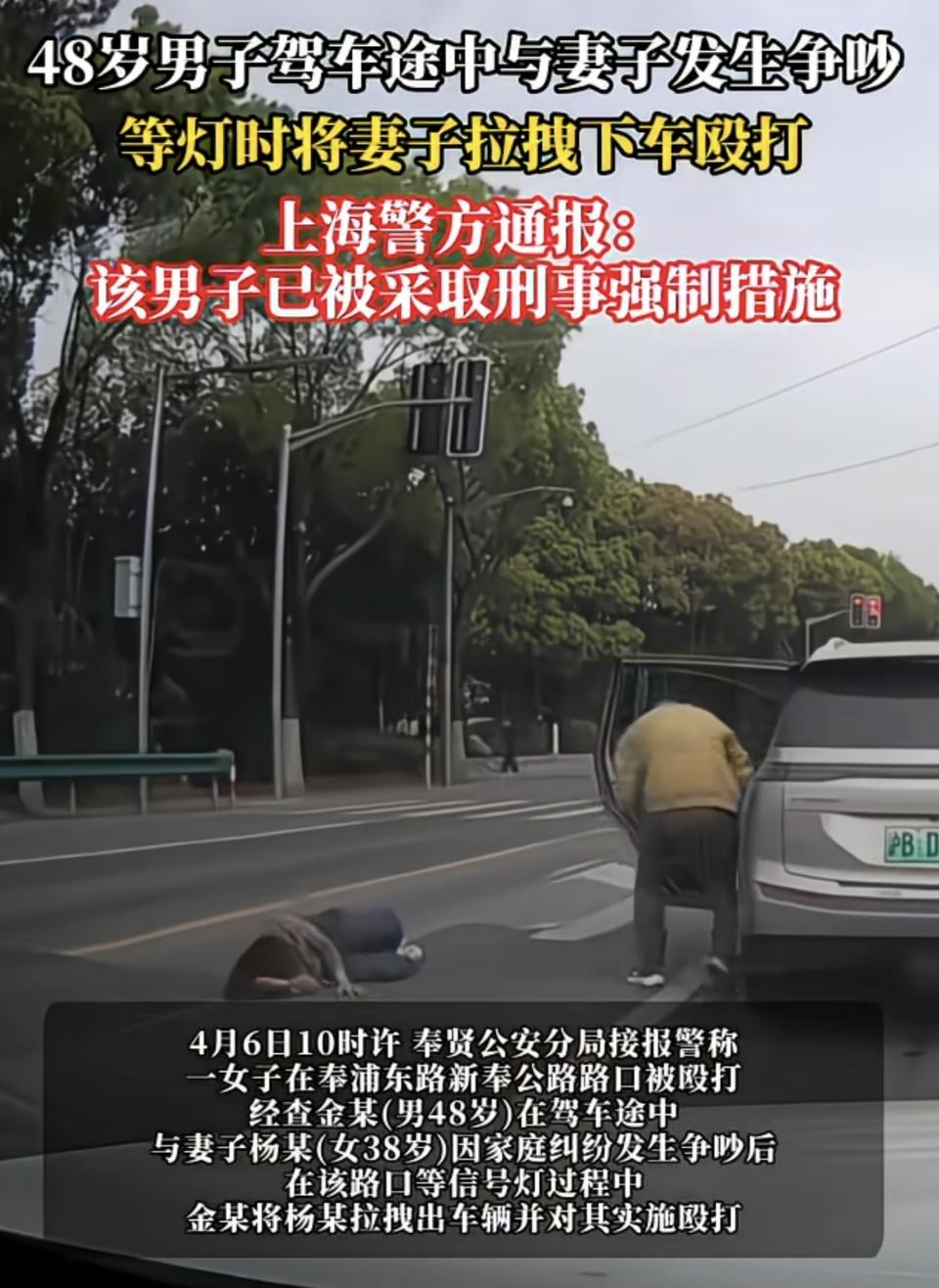 2026年4月6日10时许,上海奉贤区奉浦东路新奉公路路口,48岁男子金某驾车途中与38岁妻子杨某因家庭纠纷发生争吵,在路口等信号灯时,将杨某强行拉拽下车并当众殴打。杨某送医后无生命危险,金某已被警方依法采取刑事强制措施,案件正在进一步侦办中。