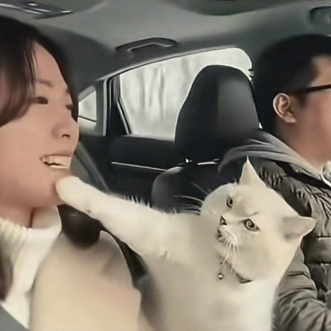 后座的猫一直在观察。耳朵竖起来,眼睛盯着前排,听了很久。然后它站起来,从后座爬到前面,四只脚踩在扶手箱上,身子凑向老婆,抬起一只软爪子,轻轻按在她嘴上。