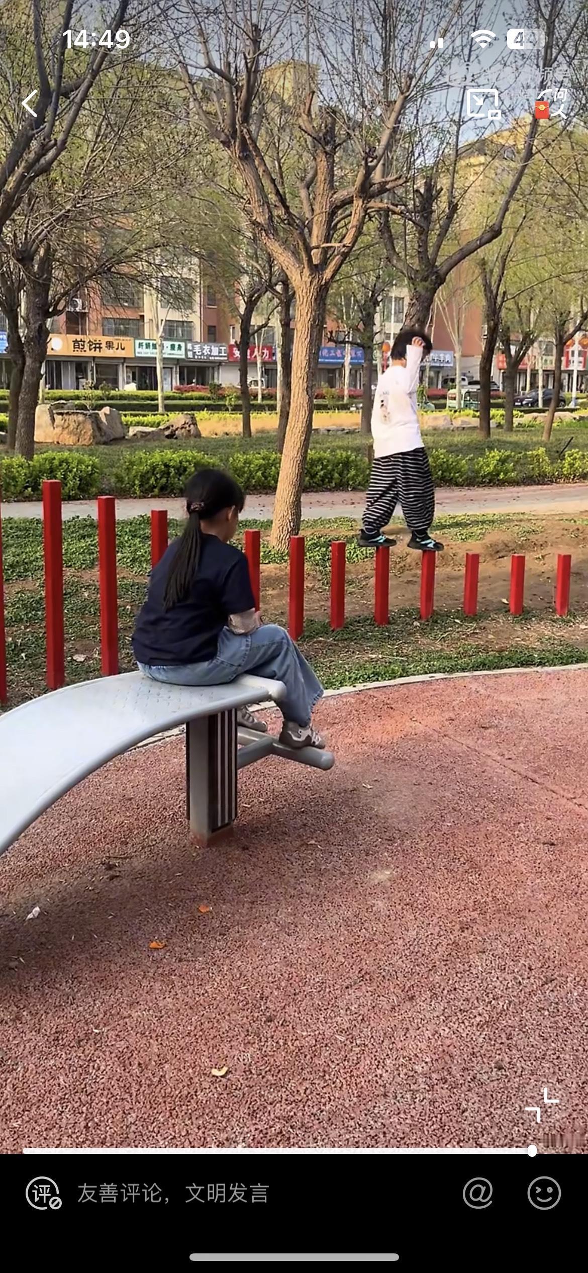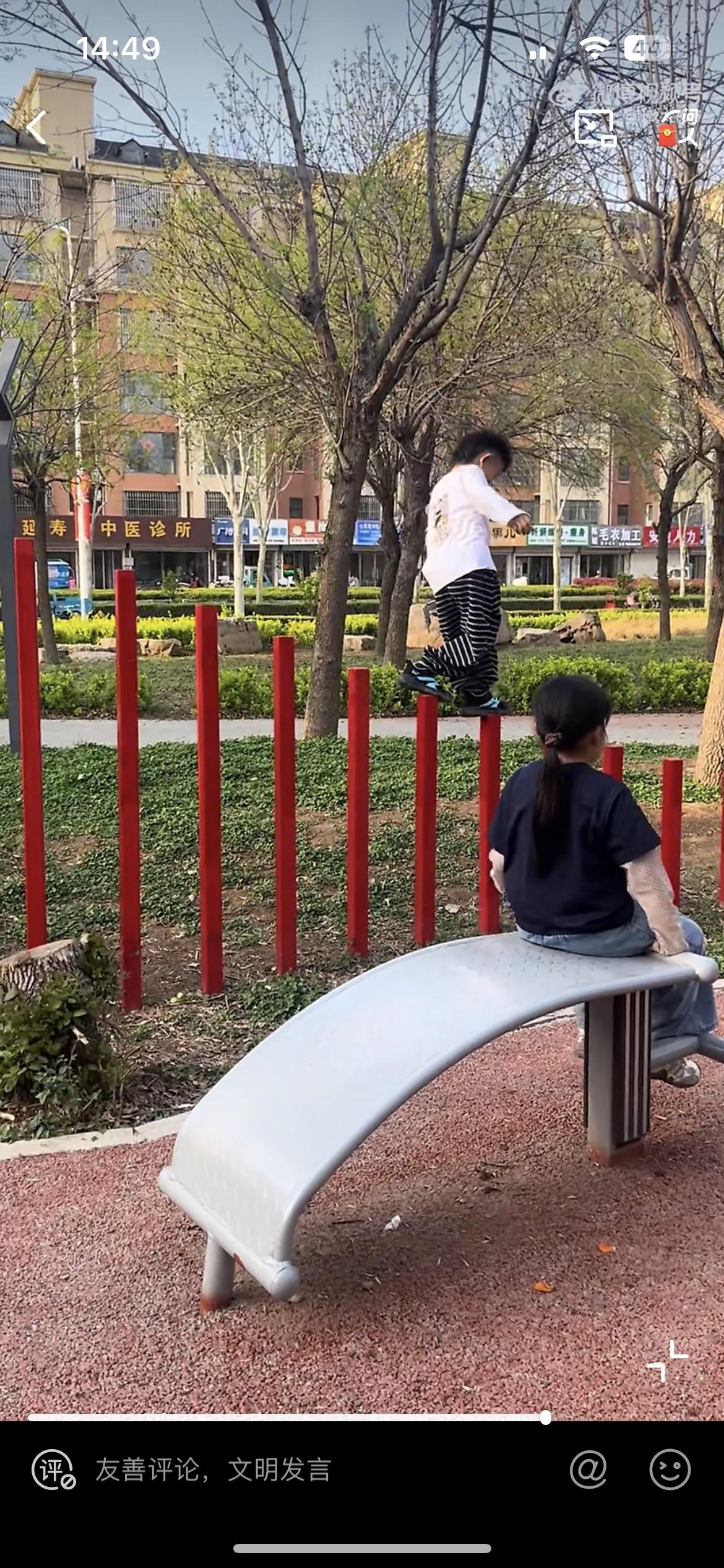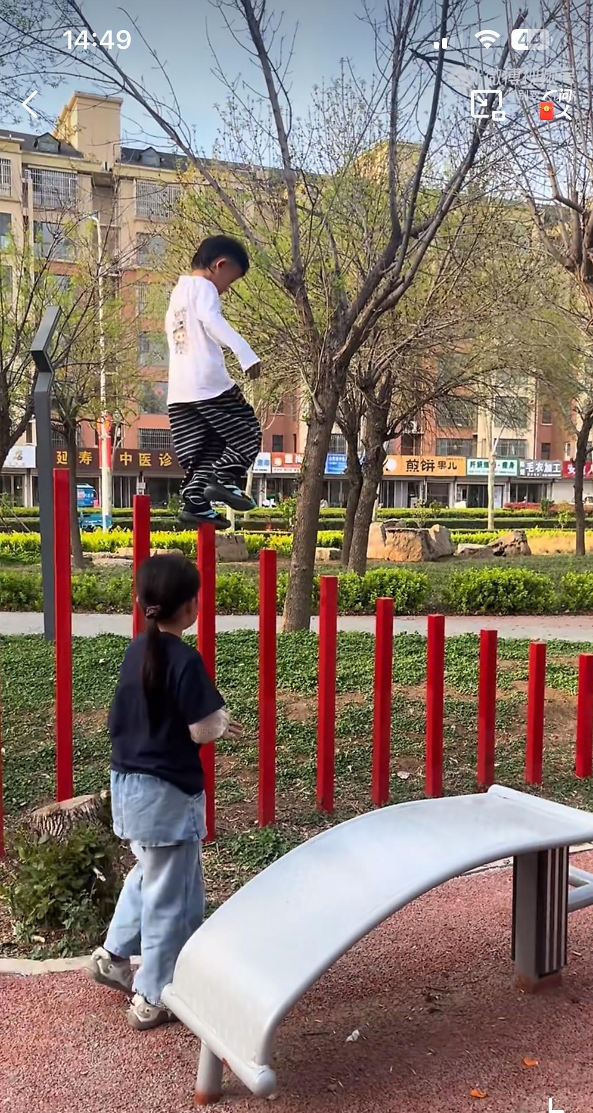 街边公园散步看到的,一男童把公园的景观护栏当着高跷来踩,看着险象环生。要是男童一脚踏空摔下来,保证他的父母会找公园管理处的麻烦,说他们没有尽到安全保障的义务。明显男童是和他的家长一起来玩的,旁边有人在拍视频。男童的行为是被家长鼓励的,在他们眼里孩子很勇敢,平衡力非常棒,是一个杂技小天才。每一个熊孩子背后,必然有一个默默鼓励和支持的家长。