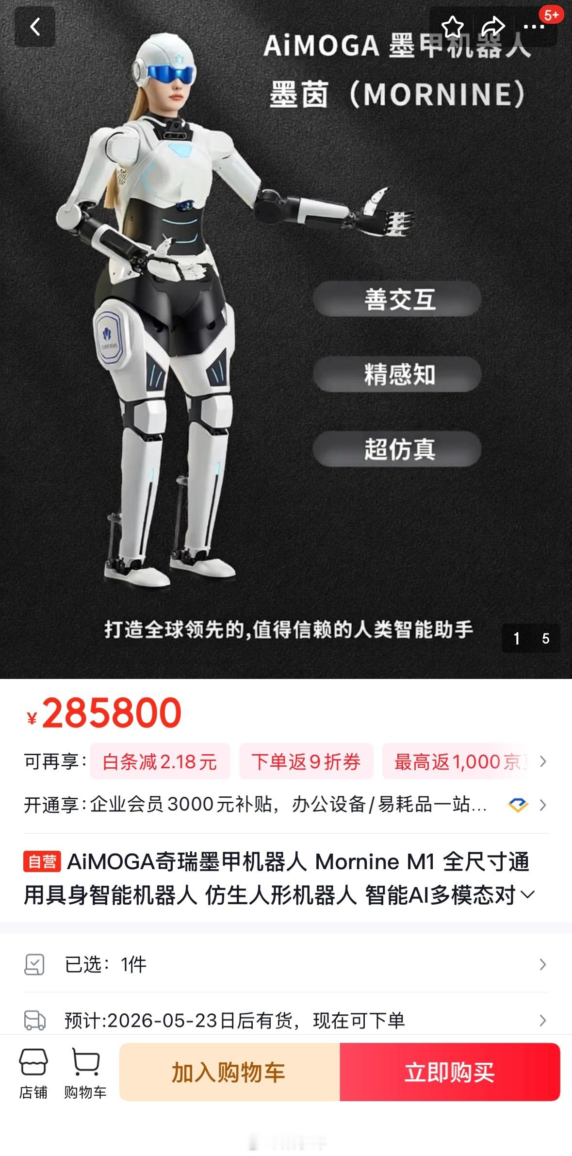 奇瑞旗下人形机器人售价28.58万身高167cm/体重70kg行走速度1m/s,±5cm精准导航2小时快充,续航2小时手臂可负载1.5kg自主开车门双手协同操作(倒水/递物)28.58万一个5月23日起发货