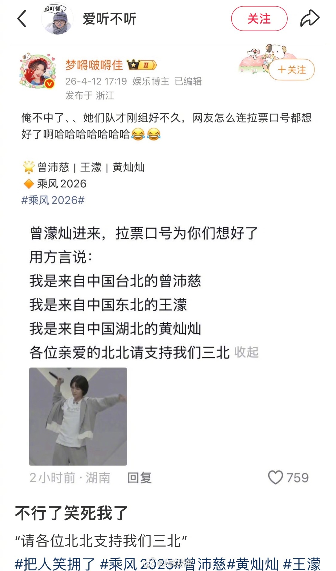 乘风2026 浪姐二公分组网友帮曾沛慈 王濛 黄灿灿想好拉票口号了中国三北组合:台北 东北 湖北也称:北立方 北幂