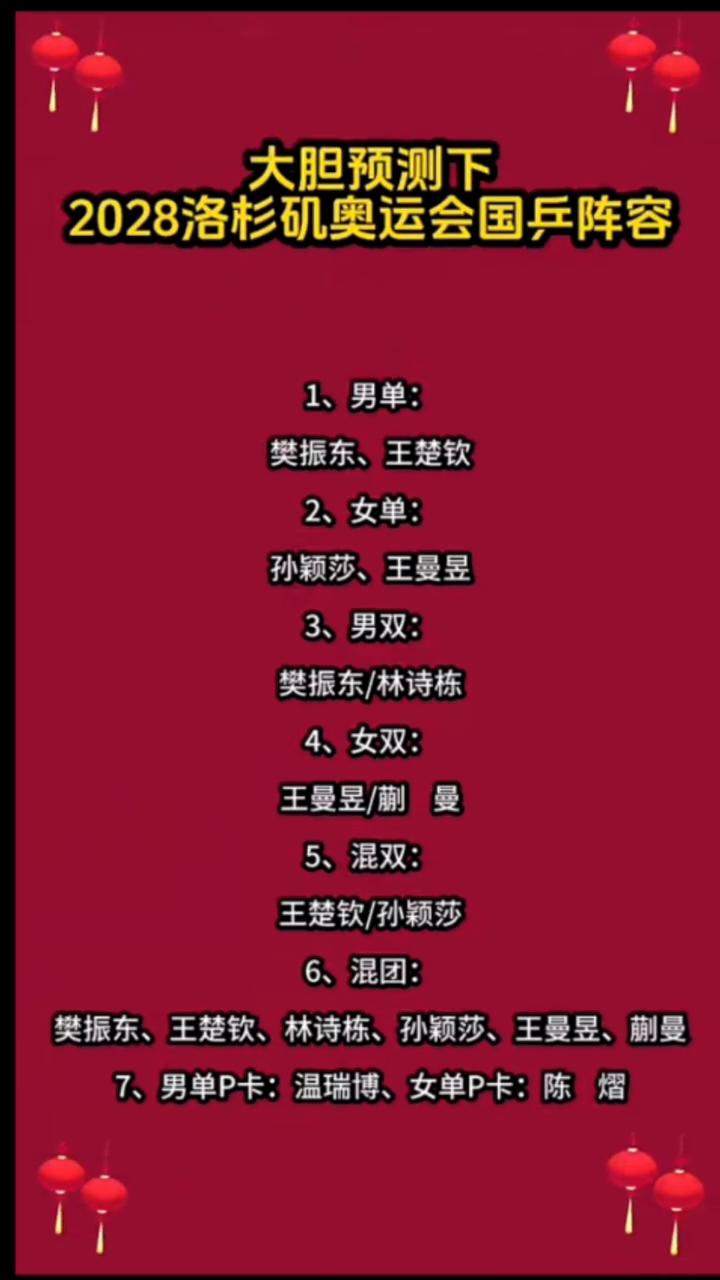大胆预测下2028洛杉矶奥运会国乒阵容。 ·1、男单:樊振东、王楚钦。 ·2、女
